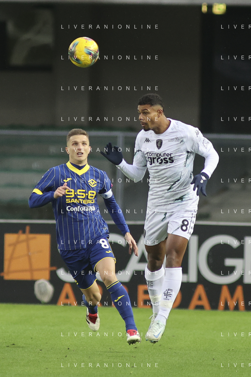 Grigoris Kastanos of Hellas Verona FC battle for the ball with Emmanuel Ekong of Empoli FC during Hellas Verona FC vs Empoli FC, 15° Serie A Enilive 2024-25 game at Marcantonio Bentegodi stadium in Verona (VR), Italy, on Dicember 08, 2024. (Photo by Davide Casentini)- AGENZIA ALDO LIVERANI SAS
