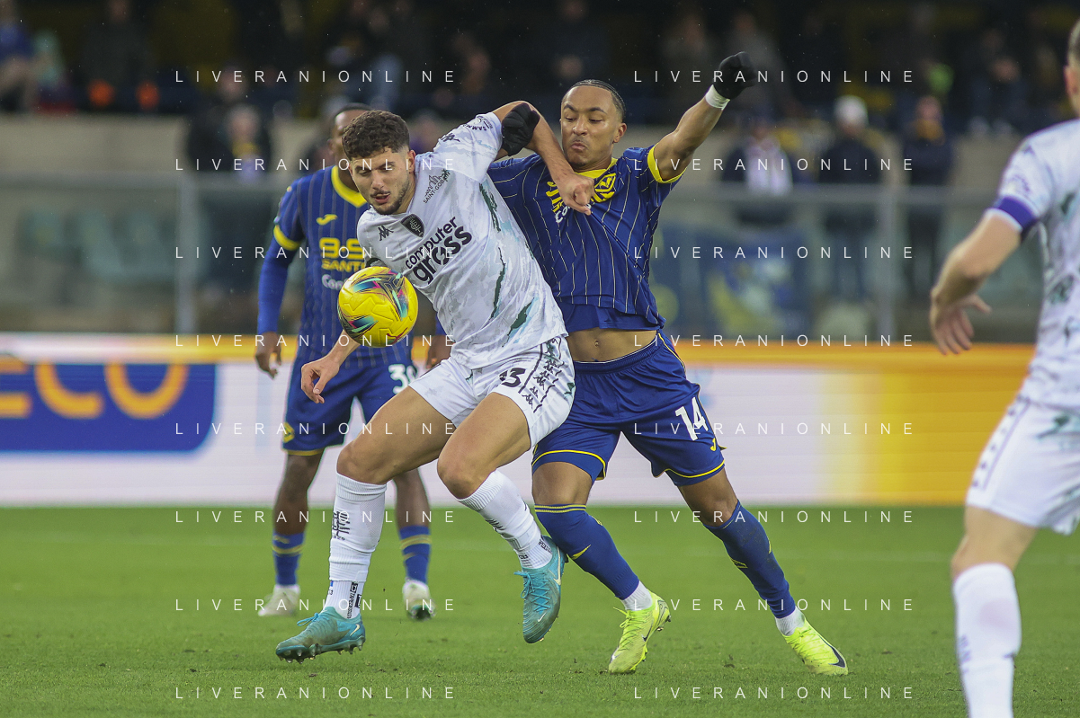 Liberato Cacace of Empoli FC battle for the ball with Dailon Rocha Livramento of Hellas Verona FC FC during Hellas Verona FC vs Empoli FC, 15° Serie A Enilive 2024-25 game at Marcantonio Bentegodi stadium in Verona (VR), Italy, on Dicember 08, 2024. (Photo by Davide Casentini) - AGENZIA ALDO LIVERANI SAS