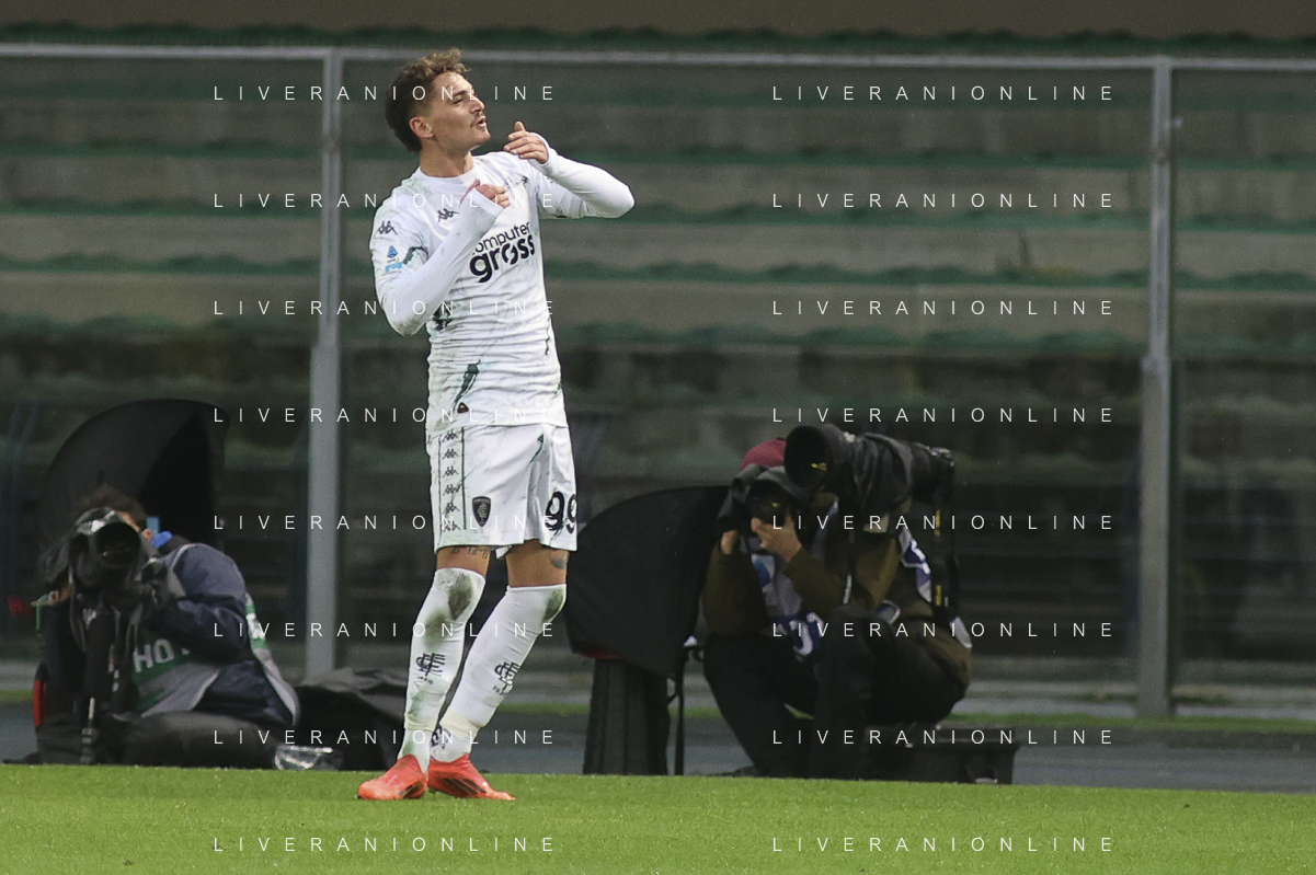 Sebastiano Esposito of Empoli FC celebrates after scoring during Hellas Verona FC vs Empoli FC, 15° Serie A Enilive 2024-25 game at Marcantonio Bentegodi stadium in Verona (VR), Italy, on Dicember 08, 2024. (Photo by Davide Casentini) - AGENZIA ALDO LIVERANI SAS
