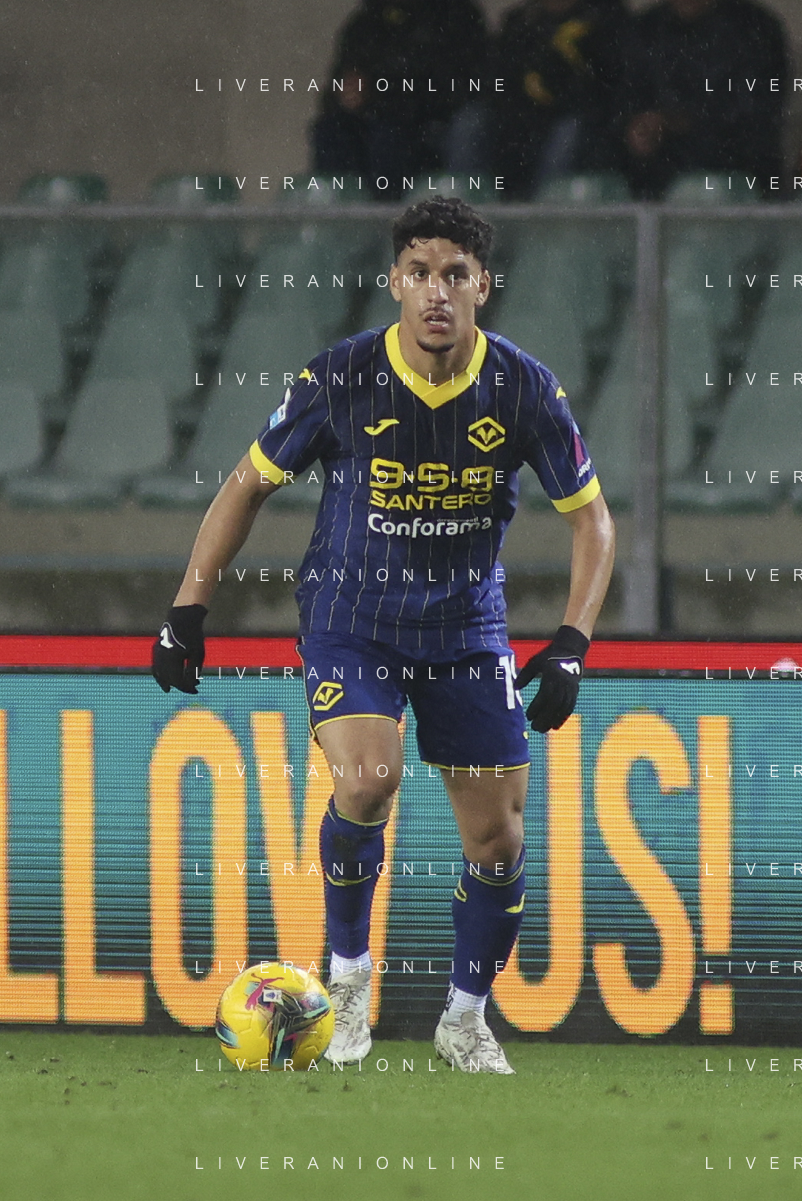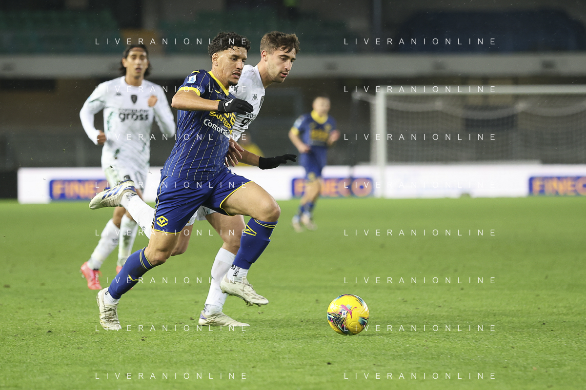 Abdou Harroui of Hellas Verona FC play the ball during Hellas Verona FC vs Empoli FC, 15° Serie A Enilive 2024-25 game at Marcantonio Bentegodi stadium in Verona (VR), Italy, on Dicember 08, 2024. (Photo by Davide Casentini)- AGENZIA ALDO LIVERANI SAS