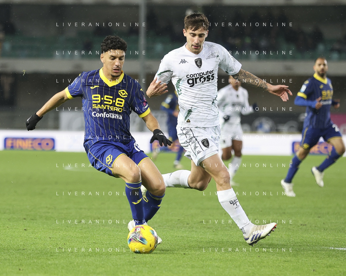 Abdou Harroui of Hellas Verona FC competes for the ball with Mattia Viti of Empoli FC during Hellas Verona FC vs Empoli FC, 15° Serie A Enilive 2024-25 game at Marcantonio Bentegodi stadium in Verona (VR), Italy, on Dicember 08, 2024. (Photo by Davide Casentini)- AGENZIA ALDO LIVERANI SAS