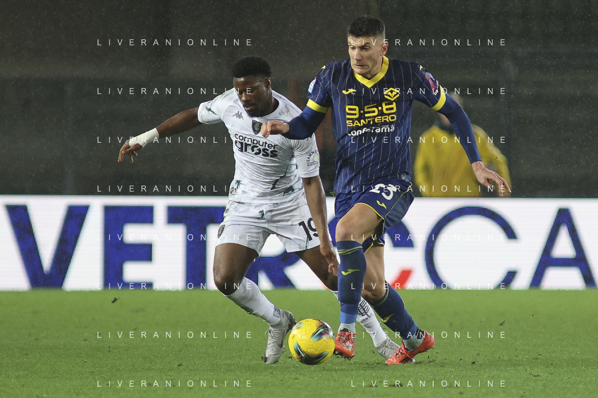 Daniel Mosquera of Hellas Verona FC battle for the ball with Ardian Ismajli of Empoli FC during Hellas Verona FC vs Empoli FC, 15° Serie A Enilive 2024-25 game at Marcantonio Bentegodi stadium in Verona (VR), Italy, on Dicember 08, 2024. (Photo by Davide Casentini)- AGENZIA ALDO LIVERANI SAS