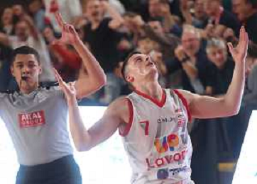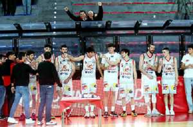 IMOLA 14 12 2024 UP ANDREA COSTA IMOLA-LEGNANO BASKET 59 70 SERIE B1 NELLA FOTO MARCO RESTELLI UP ANDREA COSTA IMOLA DOPO IL CANESTRO DA TRE PUNTI FOTO GIANNI SANNA-AG ALDO LIVERANI SAS