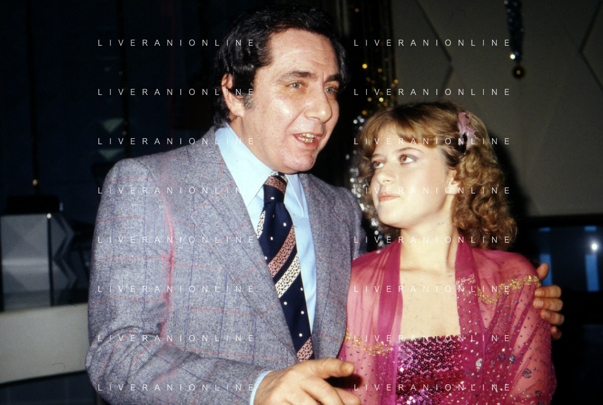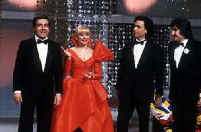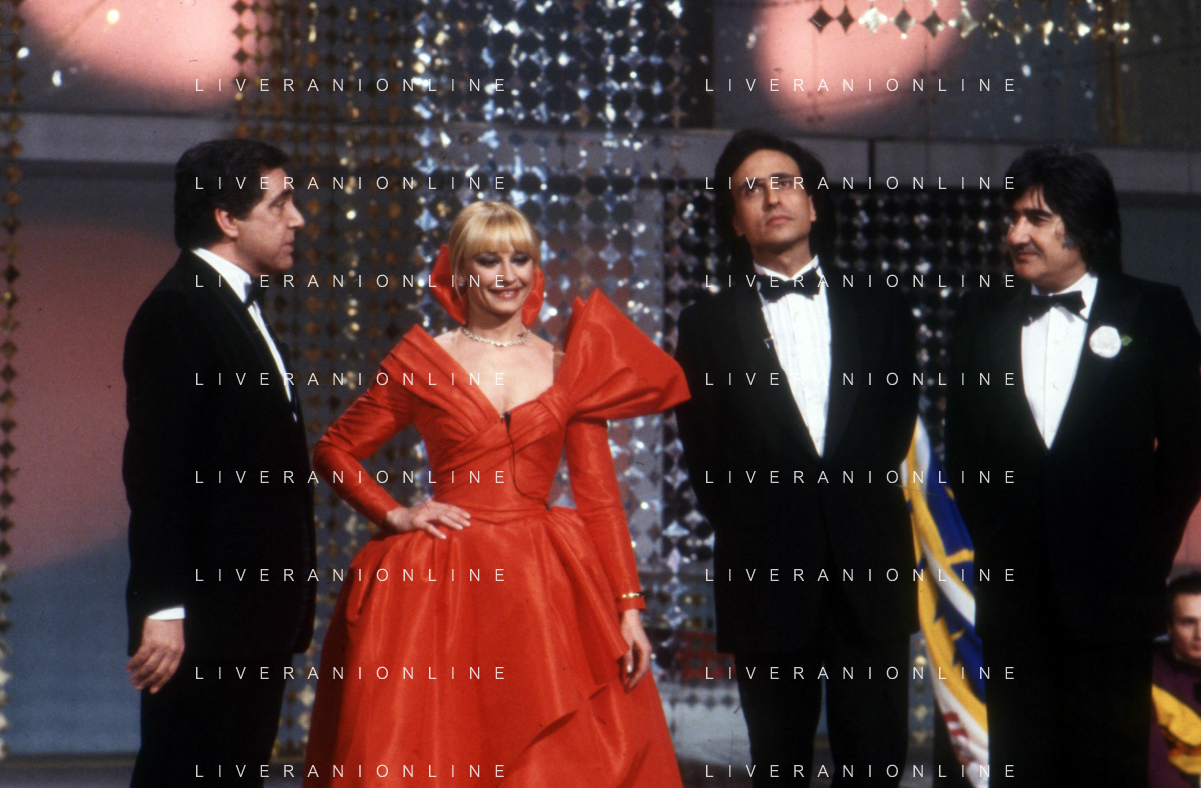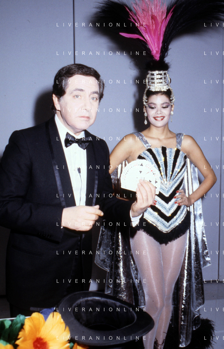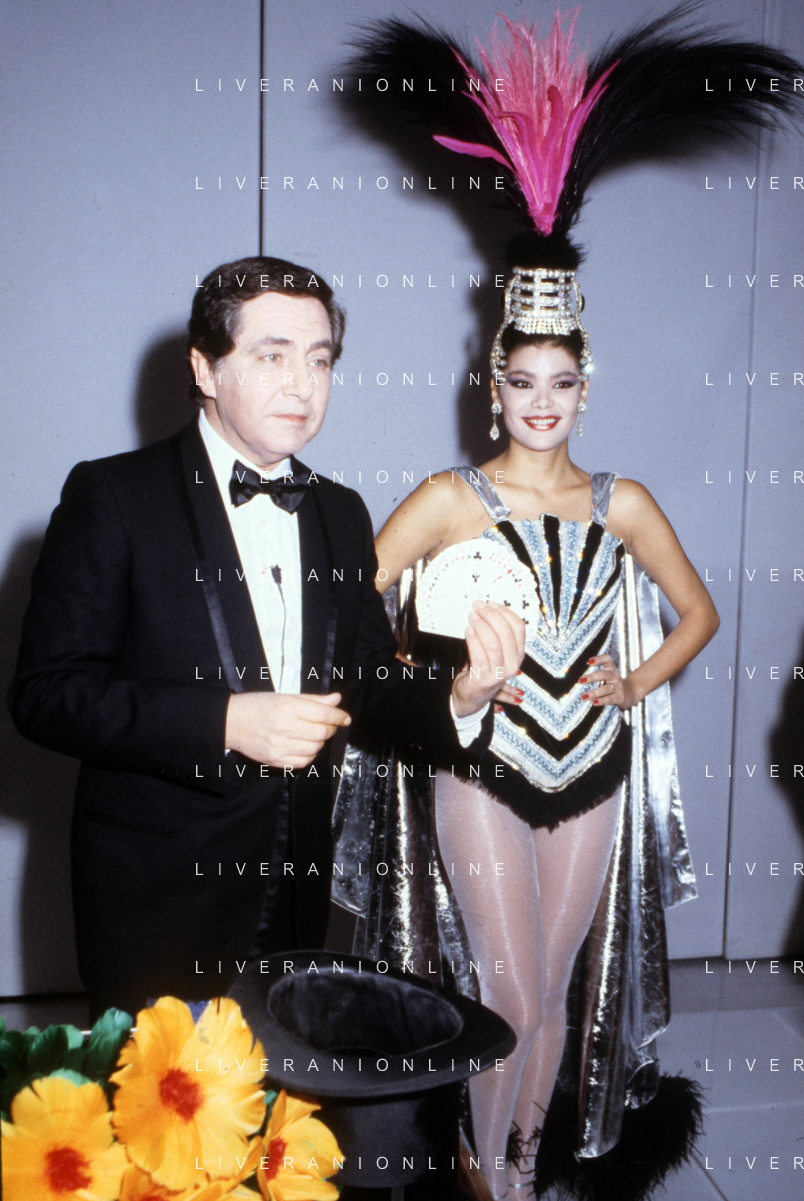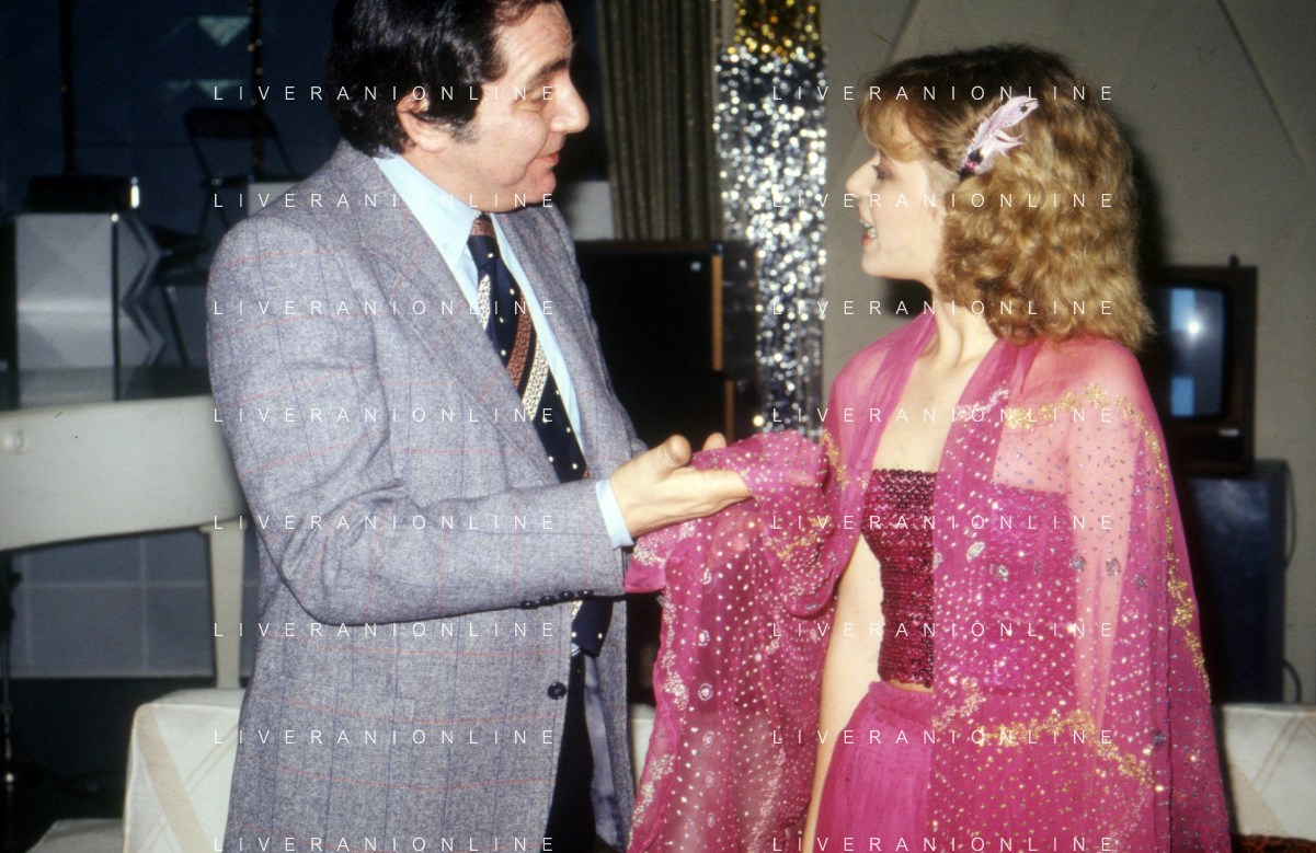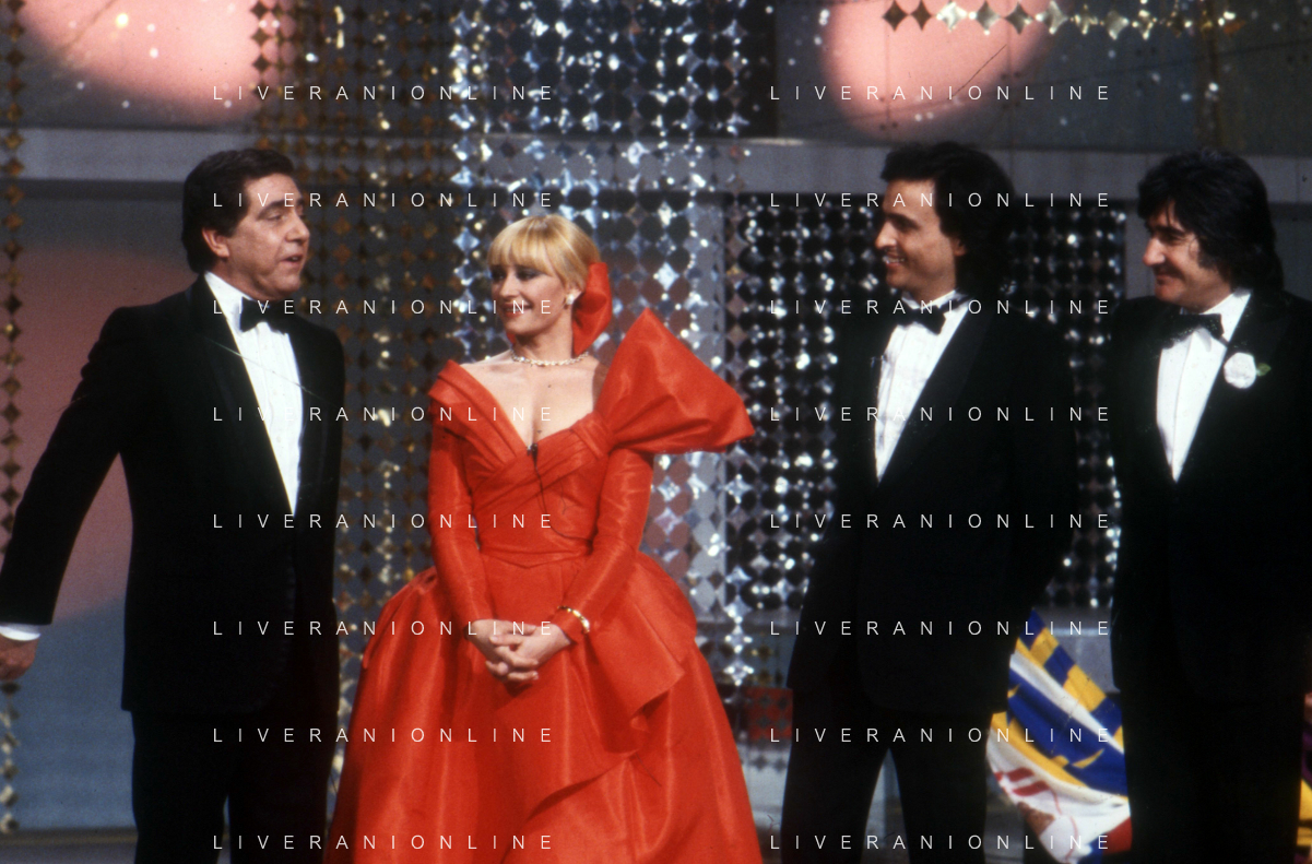 DIA-RETROSPETTIVA CORRADO MANTONI CONDUTTORE TELEVISIVO NELLA FOTO CORRADO MANTONI CON RAFFAELLA CARRA’, GIGI SABANI E IL MAESTRO TONY DE VITA A FANTASTICO 3’ NELL’ANNO 1982 AG ALDO LIVERANI SAS