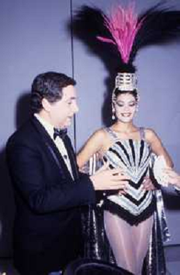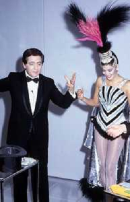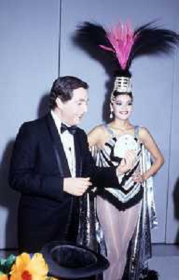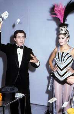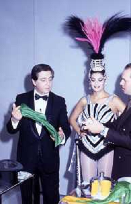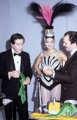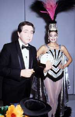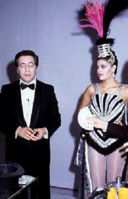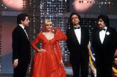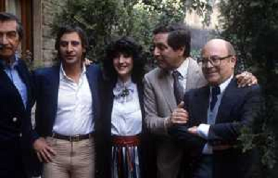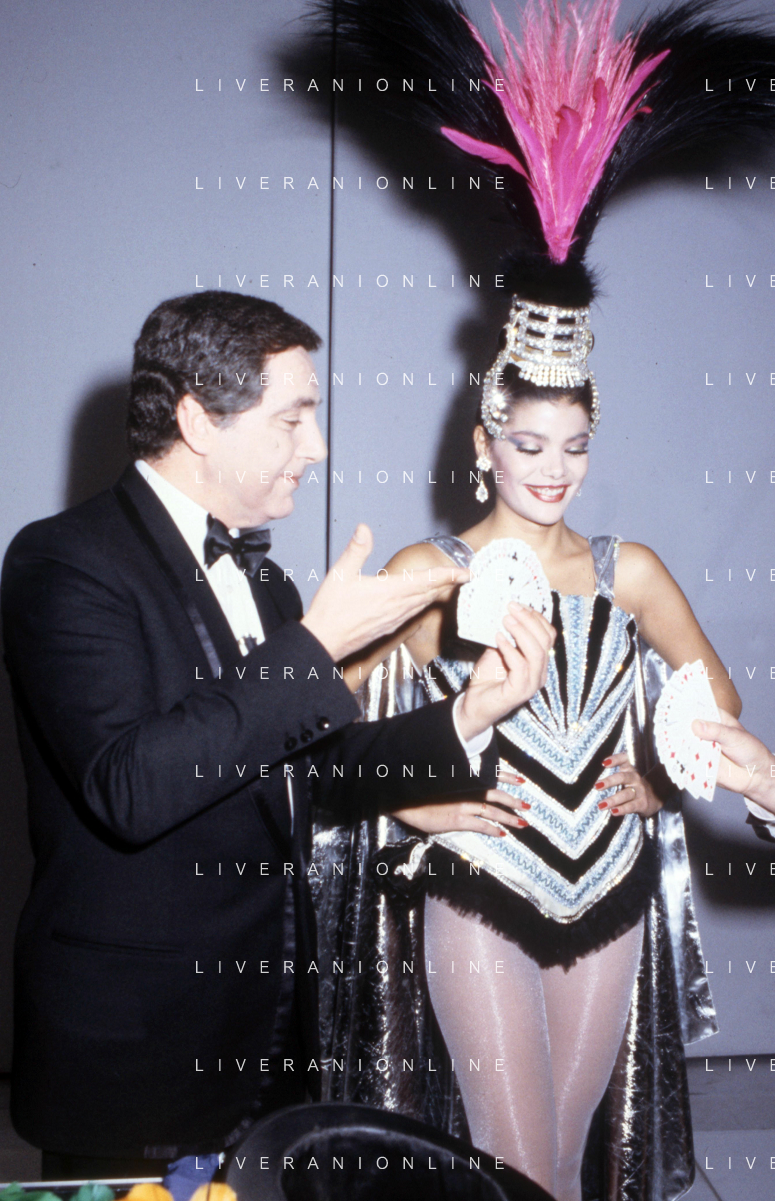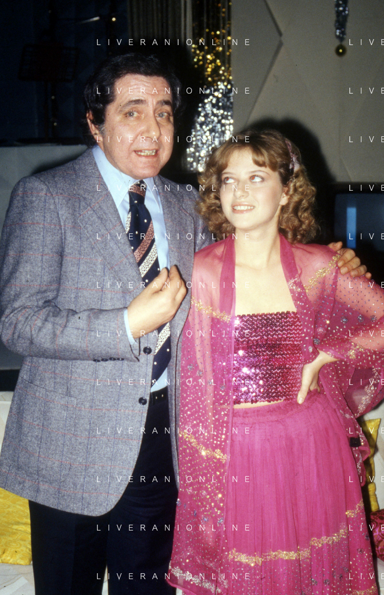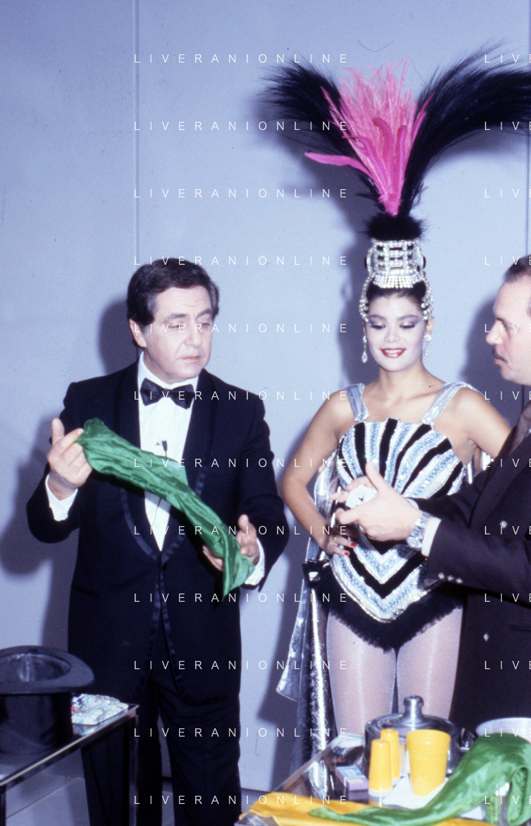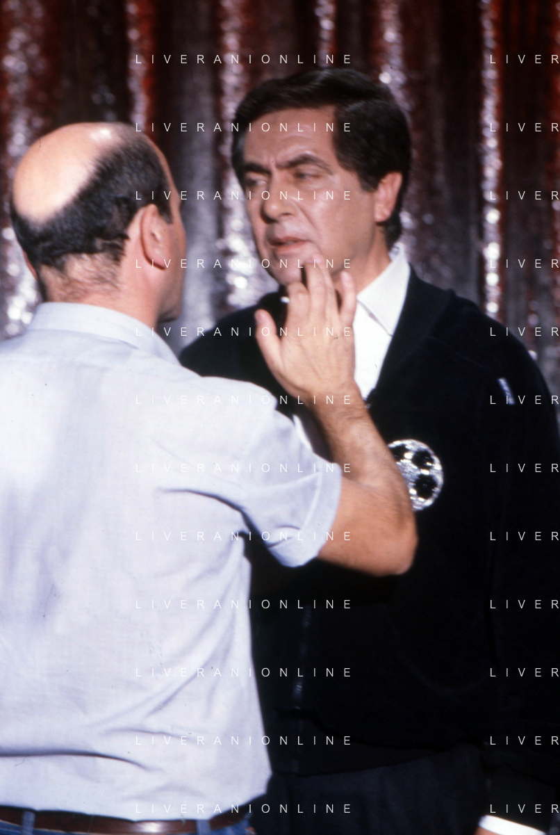 DIA-RETROSPETTIVA CORRADO MANTONI CONDUTTORE TELEVISIVO NELLA FOTO CORRADO MANTONI CON RAFFAELLA CARRA’, GIGI SABANI E IL MAESTRO TONY DE VITA A FANTASTICO 3’ NELL’ANNO 1982 AG ALDO LIVERANI SAS