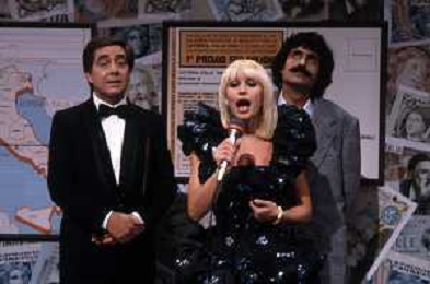 DIA-RETROSPETTIVA CORRADO MANTONI CONDUTTORE TELEVISIVO NELLA FOTO CORRADO MANTONI CON RAFFAELLA CARRA’, GIGI SABANI A FANTASTICO 3’ NELL’ANNO 1982 AG ALDO LIVERANI SAS
