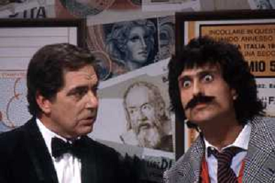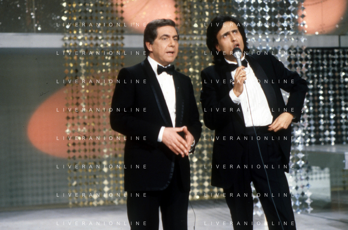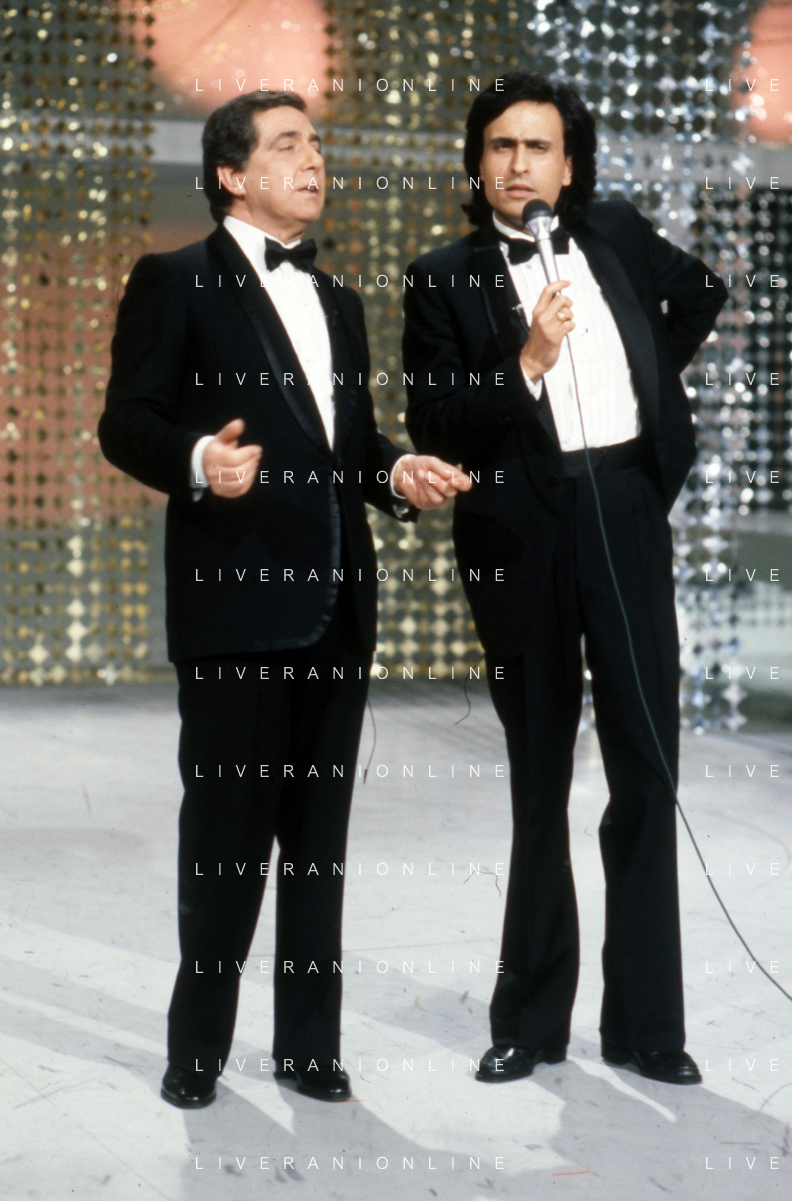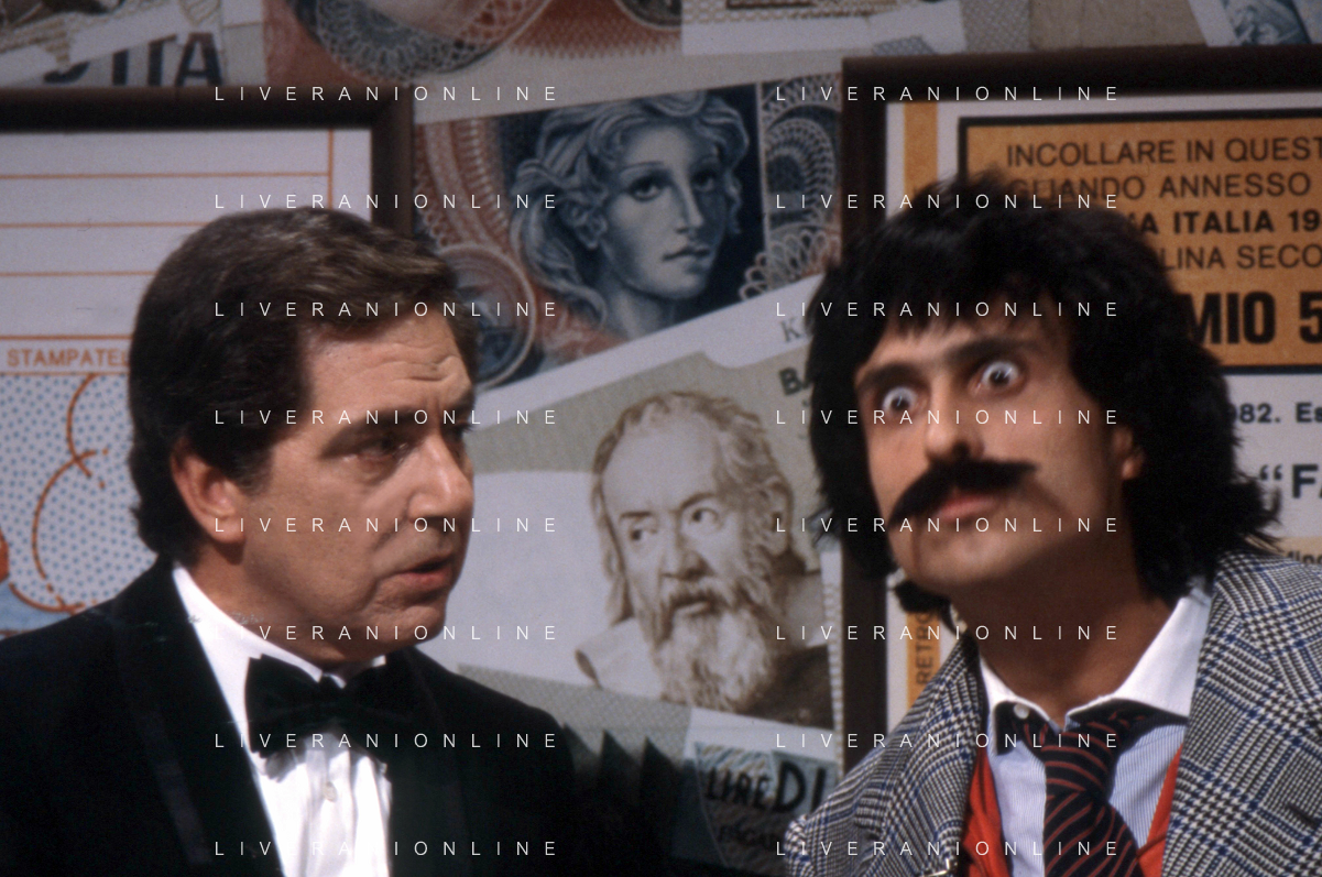 DIA-RETROSPETTIVA CORRADO MANTONI CONDUTTORE TELEVISIVO NELLA FOTO CORRADO MANTONI CON GIGI SABANI A FANTASTICO 3’ NELL’ANNO 1982 AG ALDO LIVERANI SAS