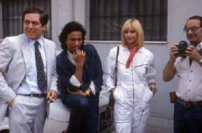 DIA-RETROSPETTIVA CORRADO MANTONI CONDUTTORE TELEVISIVO NELLA FOTO CORRADO MANTONI CON RAFFAELLA CARRA’, GIGI SABANI E IL REGISTA ENZO TRAPANI NELL’ANNO 1982 AG ALDO LIVERANI SAS