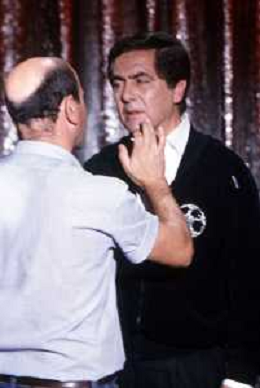 DIA-RETROSPETTIVA CORRADO MANTONI CONDUTTORE TELEVISIVO NELLA FOTO CORRADO MANTONI ALLA CONDUZIONE DE ‘IL PRANZO E’ SERVITO’ NELL’ANNO 1982 - CON STEFANO JURGENS E IL REGISTA LINO PROCACCI AG ALDO LIVERANI SAS