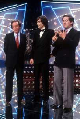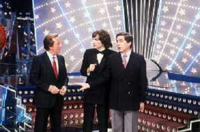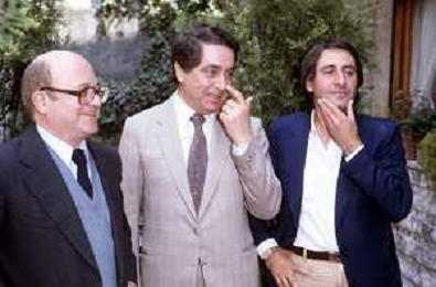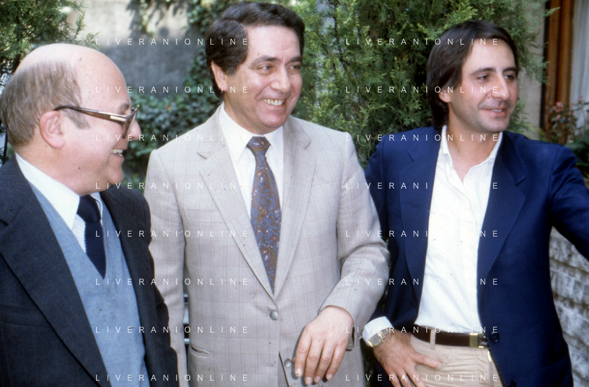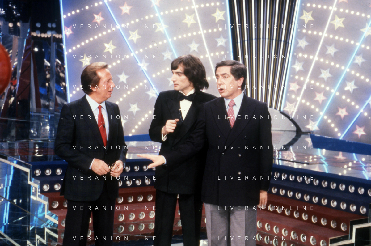 DIA-RETROSPETTIVA CORRADO MANTONI CONDUTTORE TELEVISIVO NELLA FOTO CORRADO MANTONI CON MIKE BUONGIORNO E CLAUDIO CECCHETTO NELL’ANNO 1982 AG ALDO LIVERANI SAS