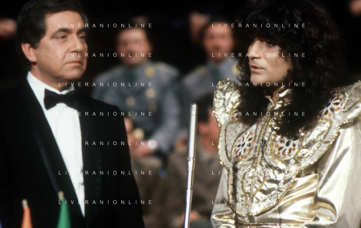 DIA-RETROSPETTIVA CORRADO MANTONI CONDUTTORE TELEVISIVO NELLA FOTO CORRADO MANTONI NELL’ANNO 1983 CON RENATO ZERO AG ALDO LIVERANI SAS