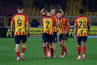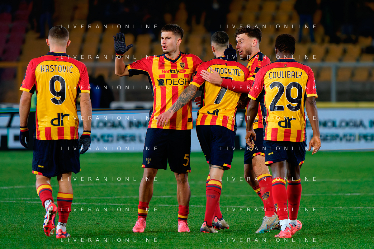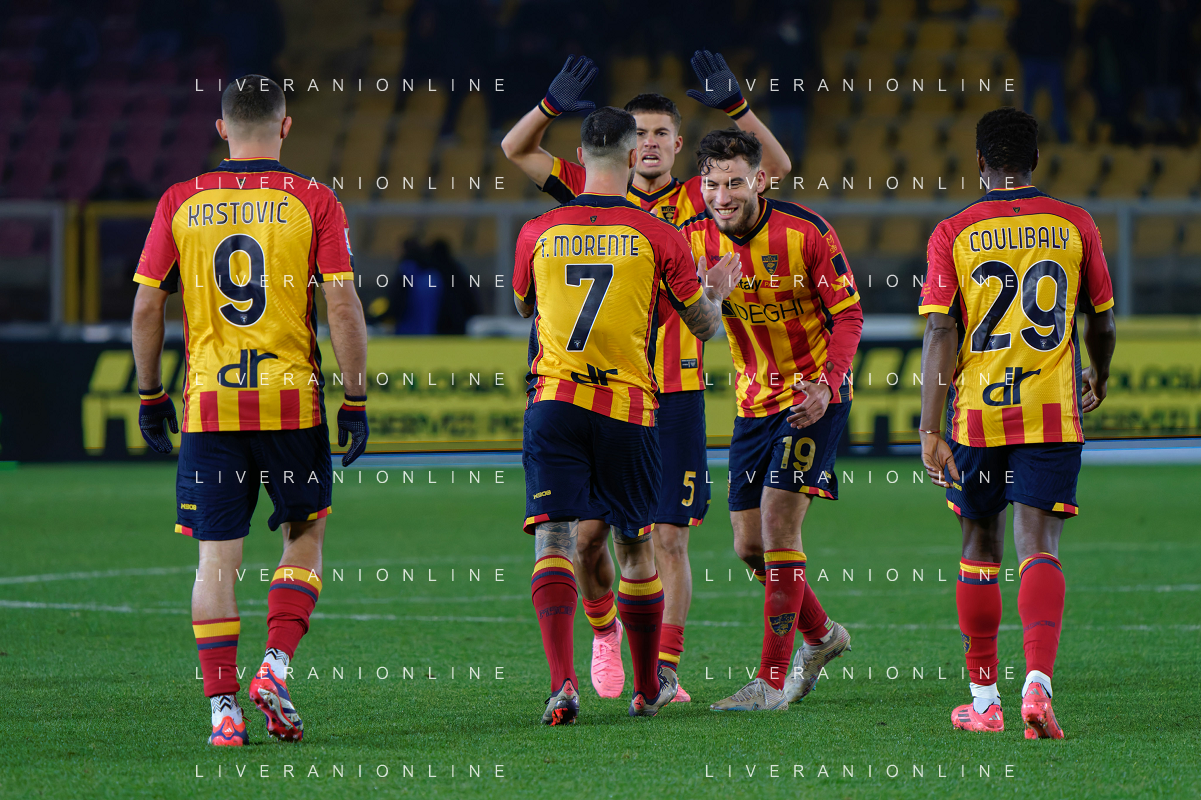 TVEM December 21, 2024 Lecce, Italy - US Lecce vs SS Lazio - Italian soccer serie A 2024/25 - Via Del Mare Stadium. In the pic: Tete Morente of US Lecce celebrates after scoring a goal with teammates foto emmanuele mastrodonato-ag aldo liverani sas