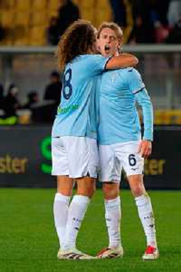 TVEM December 21, 2024 Lecce, Italy - US Lecce vs SS Lazio - Italian soccer serie A 2024/25 - Via Del Mare Stadium. In the pic: Mattéo Guendouzi of SS Lazio and Nicolò Rovella of SS Lazio celebrates the victory foto emmanuele mastrodonato-ag aldo liverani sas