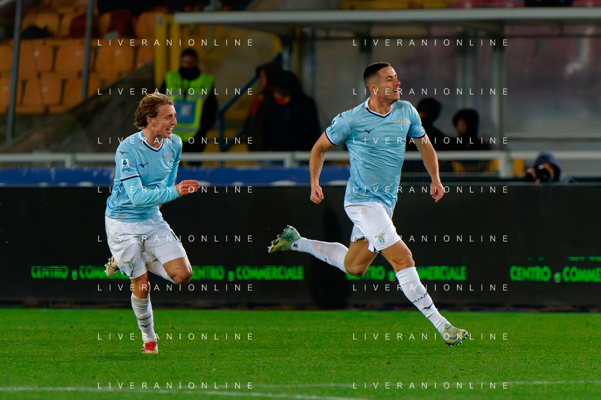 TVEM December 21, 2024 Lecce, Italy - US Lecce vs SS Lazio - Italian soccer serie A 2024/25 - Via Del Mare Stadium. In the pic: Adam Marusic of SS Lazio celebrates after scoring a goal with Nicolò Rovella of SS Lazio foto emmanuele mastrodonato-ag aldo liverani sas