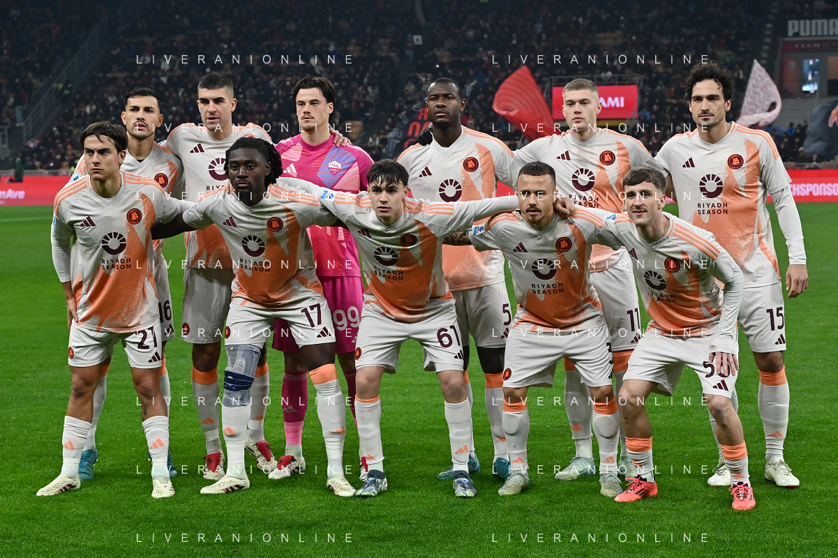 Milan vs Roma nella foto formazione Roma, in piedi da SX Leandro Paredes, Gianluca Mancini, Mile Svilar, Obite Evan N'Dicka, Artem Dovbyk e Mats Hummels; in basso da SX Paulo Dybala, Manu Kouadio Koné, Niccolo' Pisilli, Angelino José Angel Esmoris e Alexis Saelemaekers Milano 29-12-2024 Stadio Giuseppe Meazza - San Siro Campionato Serie A Enilive - 18a giornata foto Roberto Garavaglia/Agenzia Aldo Liverani sas