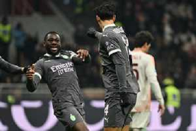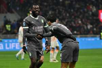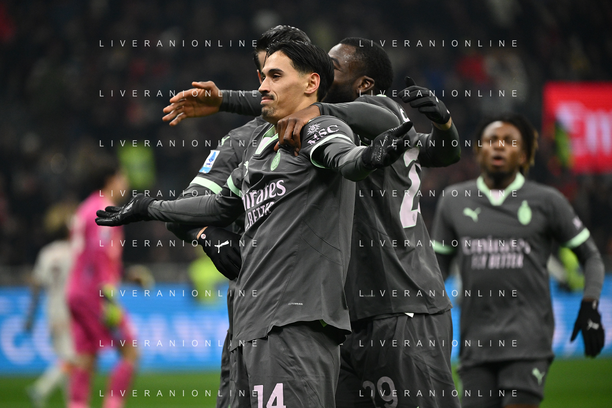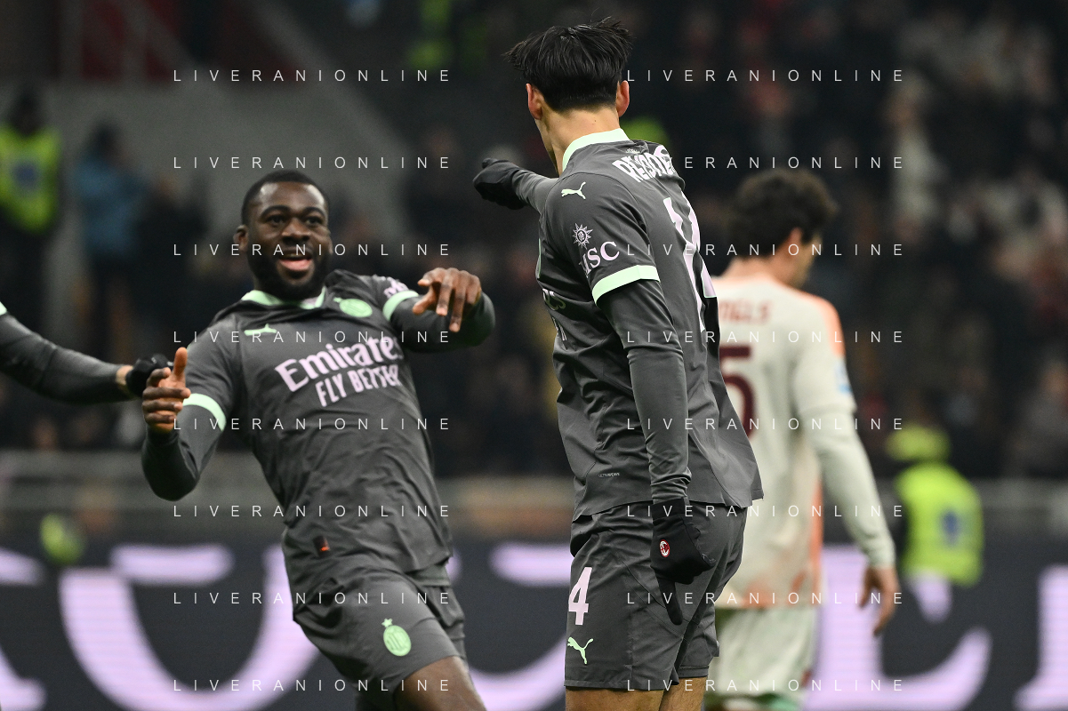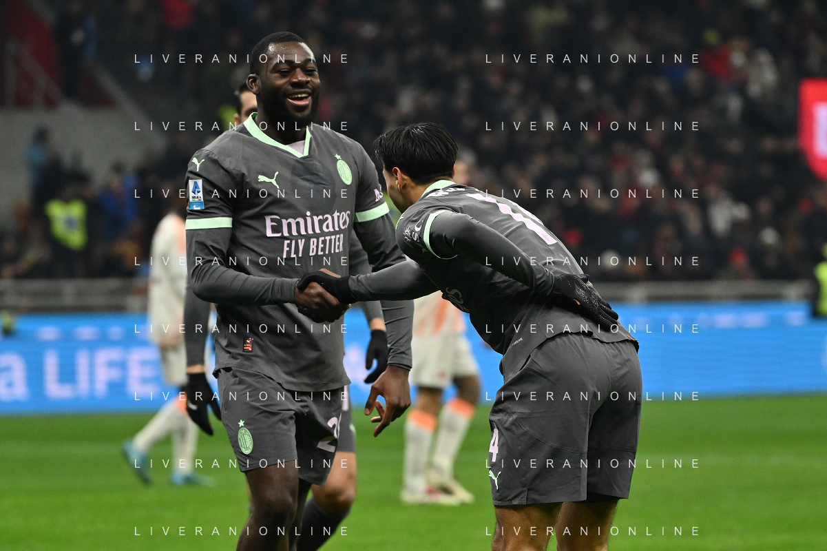 Milan vs Roma nella foto Youssouf Fofana (Milan) er Tijjani Reijnders (Milan) esultanza dopo il gol dell'1 a 0 Milano 29-12-2024 Stadio Giuseppe Meazza - San Siro Campionato Serie A Enilive - 18a giornata foto Roberto Garavaglia/Agenzia Aldo Liverani sas