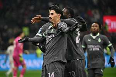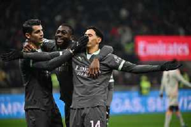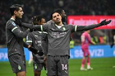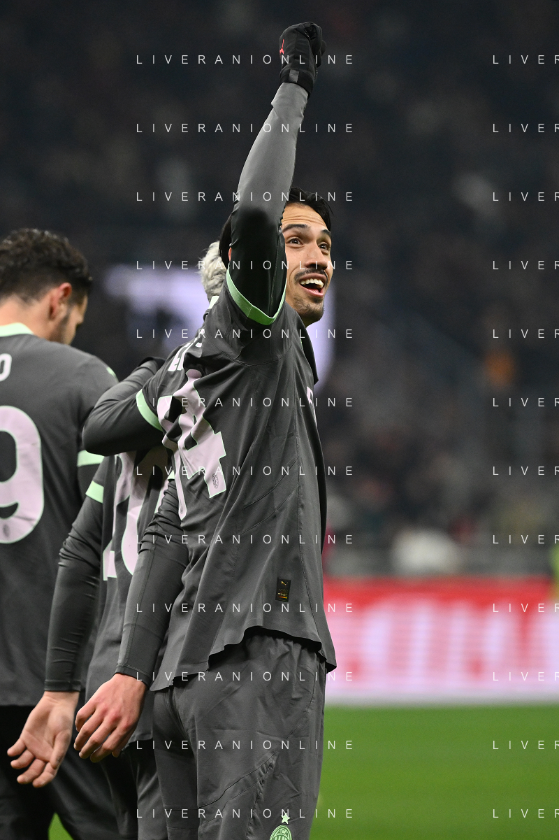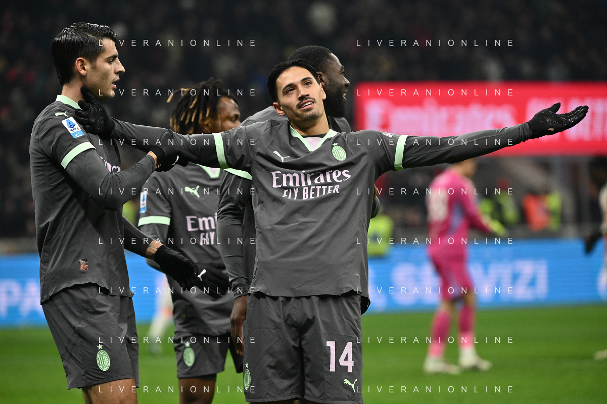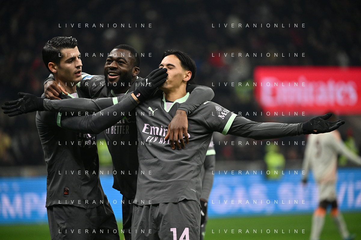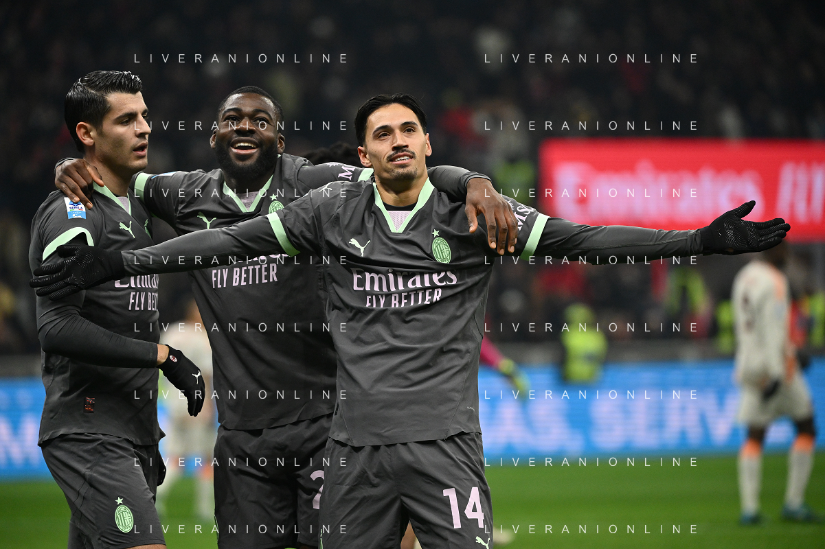 Milan vs Roma nella foto da SX Alvaro Morata (Milan), Youssouf Fofana (Milan)e Tijjani Reijnders (Milan) esultanza dopo il gol dell'1 a 0 Milano 29-12-2024 Stadio Giuseppe Meazza - San Siro Campionato Serie A Enilive - 18a giornata foto Roberto Garavaglia/Agenzia Aldo Liverani sas