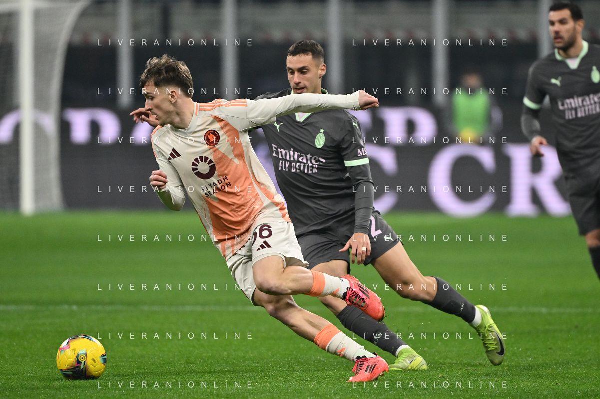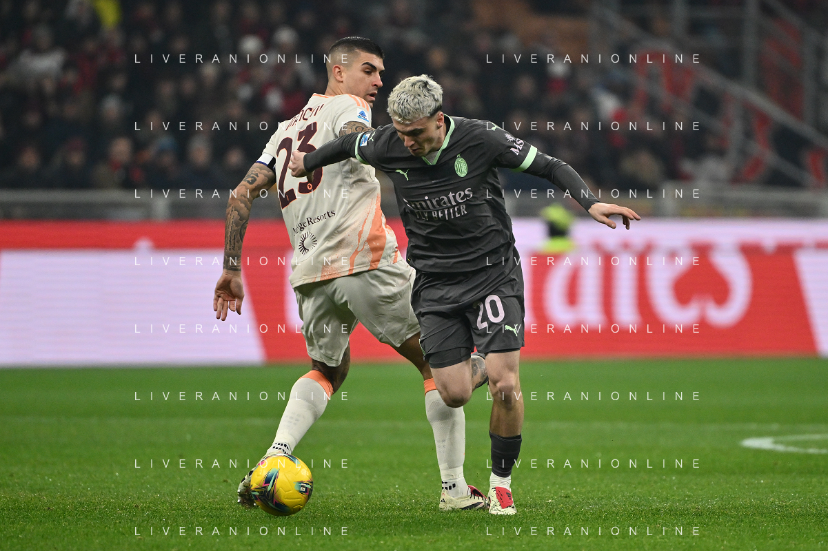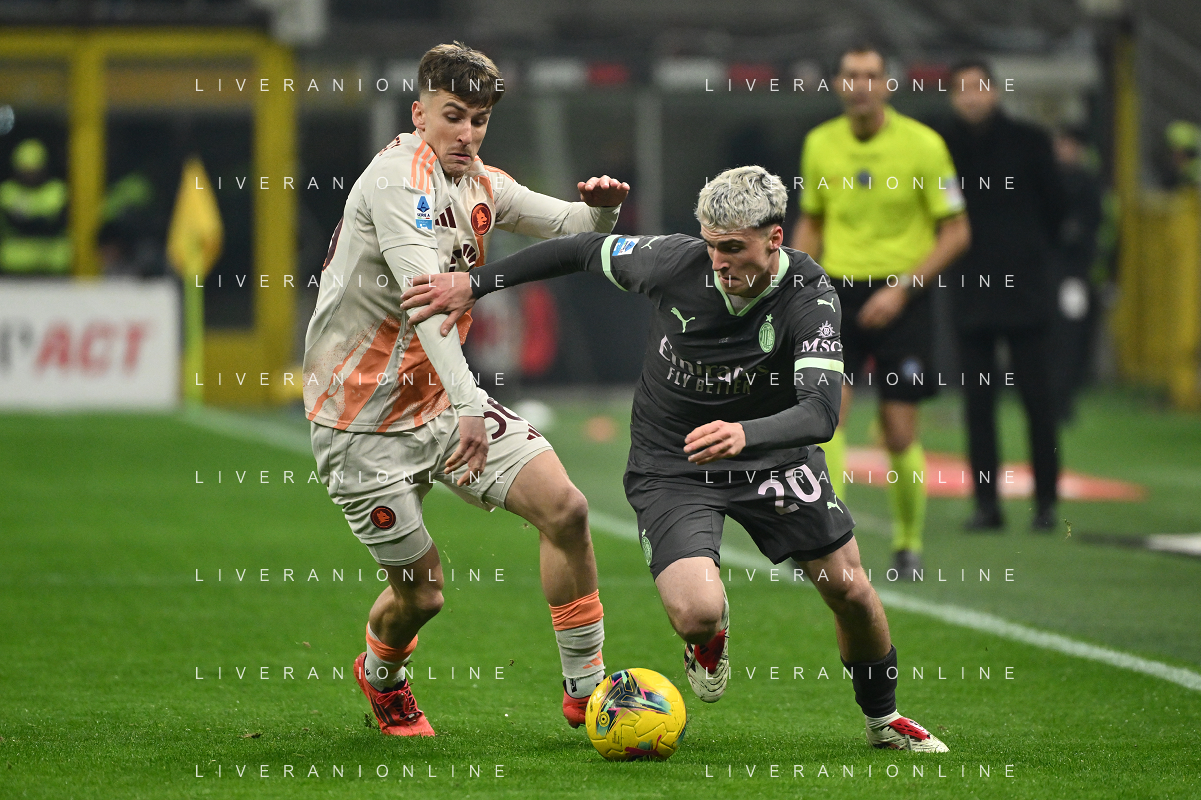 Milan vs Roma nella foto Alexis Saelemaekers (Roma) e Filippo Terracciano (Milan) Milano 29-12-2024 Stadio Giuseppe Meazza - San Siro Campionato Serie A Enilive - 18a giornata foto Roberto Garavaglia/Agenzia Aldo Liverani sas