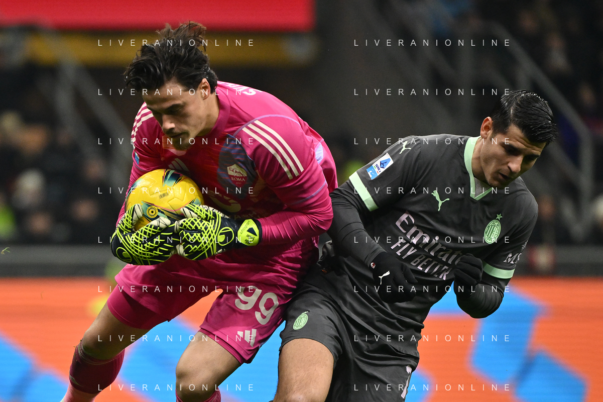 Milan vs Roma nella foto Mile Svilar (Roma) e Alvaro Morata (Milan) Milano 29-12-2024 Stadio Giuseppe Meazza - San Siro Campionato Serie A Enilive - 18a giornata foto Roberto Garavaglia/Agenzia Aldo Liverani sas