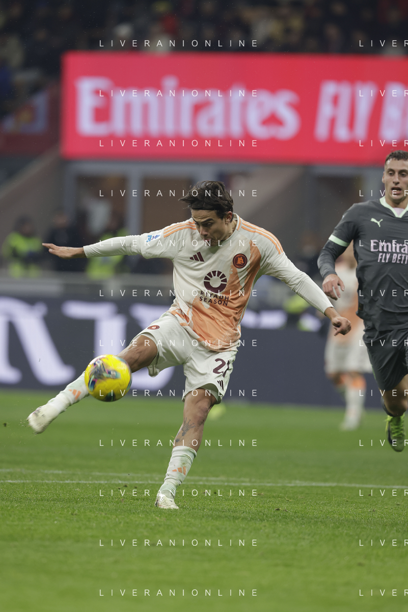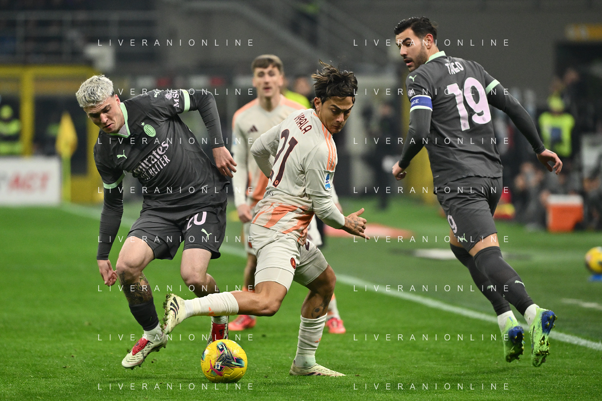 Milan vs Roma nella foto Paulo Dybala (Roma) tra Alejandro Jimenez (Milan) e Theo Hernandez (Milan) Milano 29-12-2024 Stadio Giuseppe Meazza - San Siro Campionato Serie A Enilive - 18a giornata foto Roberto Garavaglia/Agenzia Aldo Liverani sas