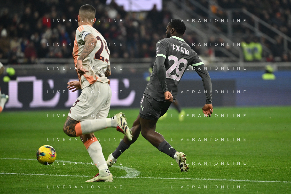 Milan vs Roma nella foto Youssouf Fofana (Milan) serve a Tijjani Reijnders (Milan) la palla per il gol dell'01 a 0 Milano 29-12-2024 Stadio Giuseppe Meazza - San Siro Campionato Serie A Enilive - 18a giornata foto Roberto Garavaglia/Agenzia Aldo Liverani sas