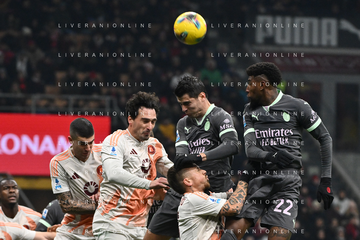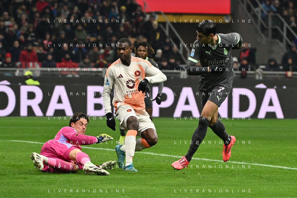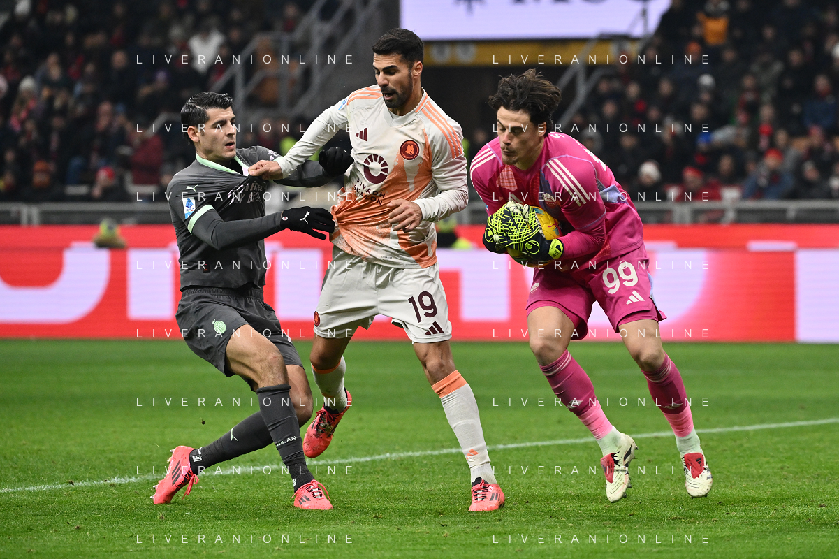 Milan vs Roma nella foto da SX Alvaro Morata (Milan), Mehmet Zeki Celik (Roma) e Mile Svilar (Roma) Milano 29-12-2024 Stadio Giuseppe Meazza - San Siro Campionato Serie A Enilive - 18a giornata foto Roberto Garavaglia/Agenzia Aldo Liverani sas- AGENZIA ALDO LIVERANI SAS