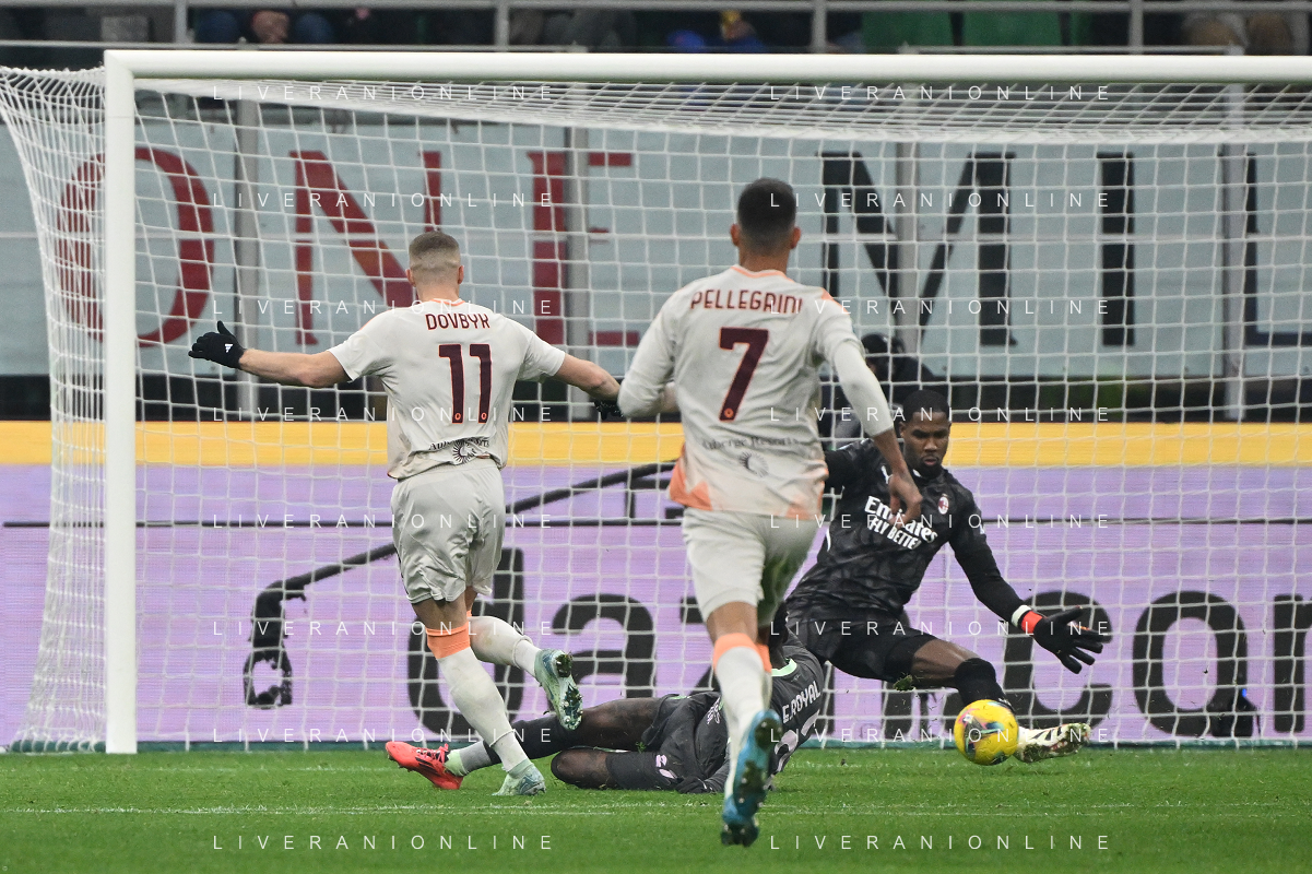 Milan vs Roma nella foto Niccolo' Pisilli (Roma) occasione da gol parata da Mike Maignan (Milan) Milano 29-12-2024 Stadio Giuseppe Meazza - San Siro Campionato Serie A Enilive - 18a giornata foto Roberto Garavaglia/Agenzia Aldo Liverani sas- AGENZIA ALDO LIVERANI SAS
