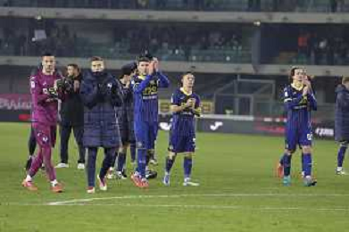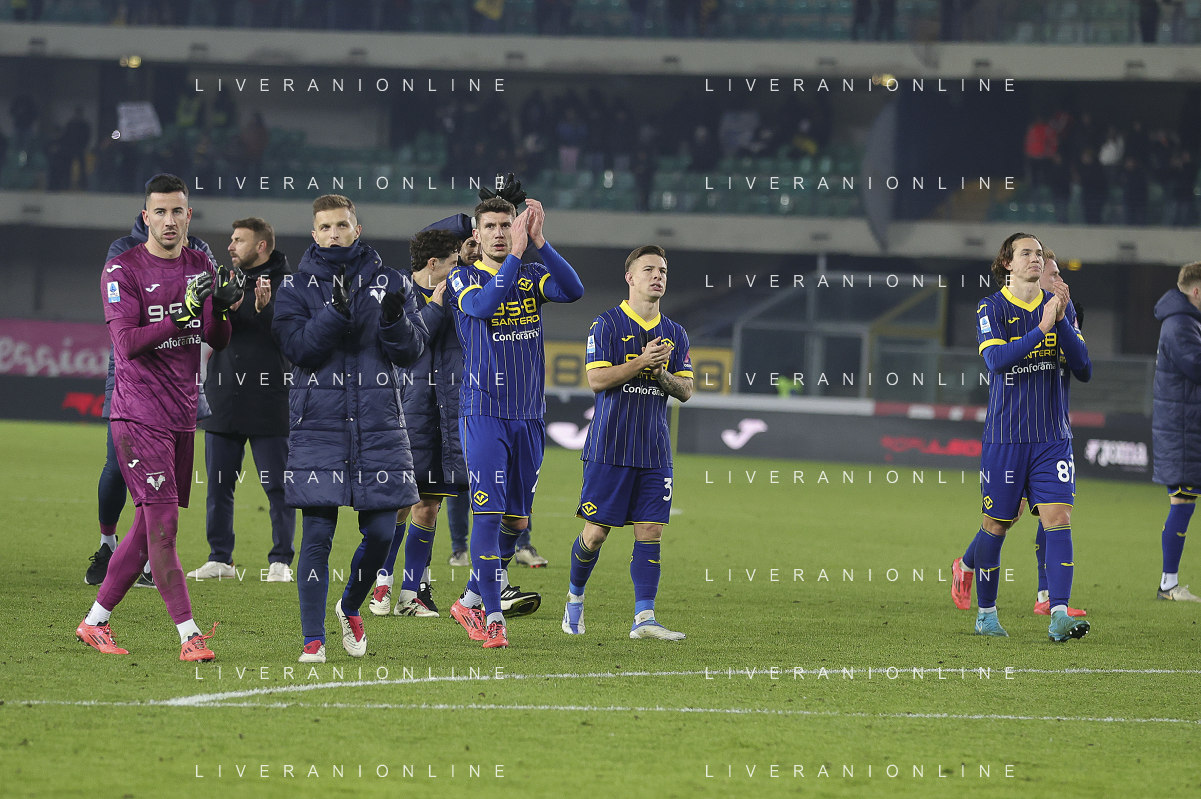 Hellas Verona players applaud the fans following the final whistleduring Hellas Verona FC vs Udinese Calcio, 19° Serie A Enilive 2024-25 game at Marcantonio Bentegodi stadium in Verona (VR), Italy, on January 04, 2025. (Photo by Davide Casentini)-AGENZIA ALDO LIVERANI SAS