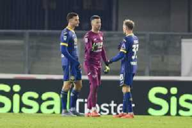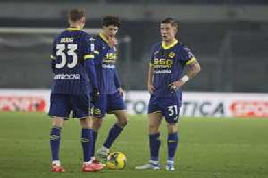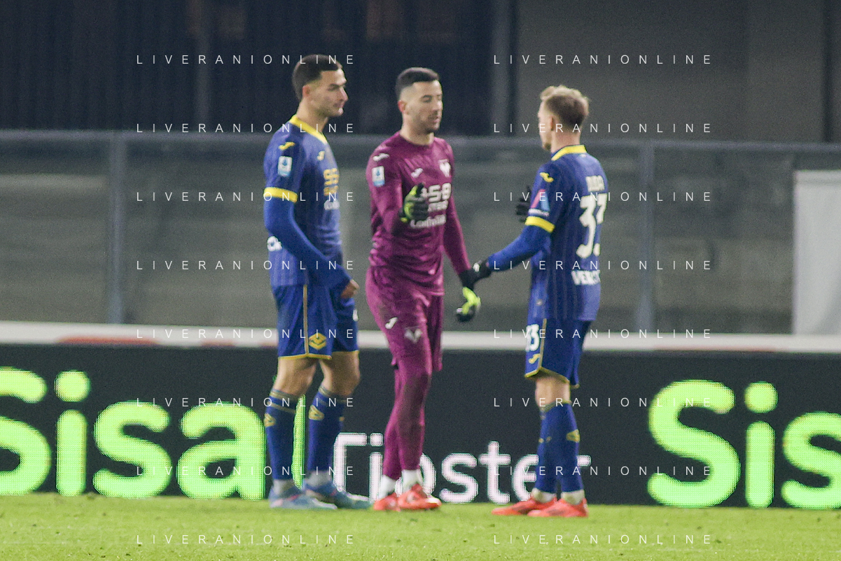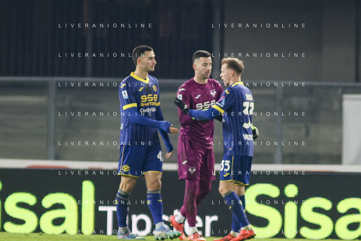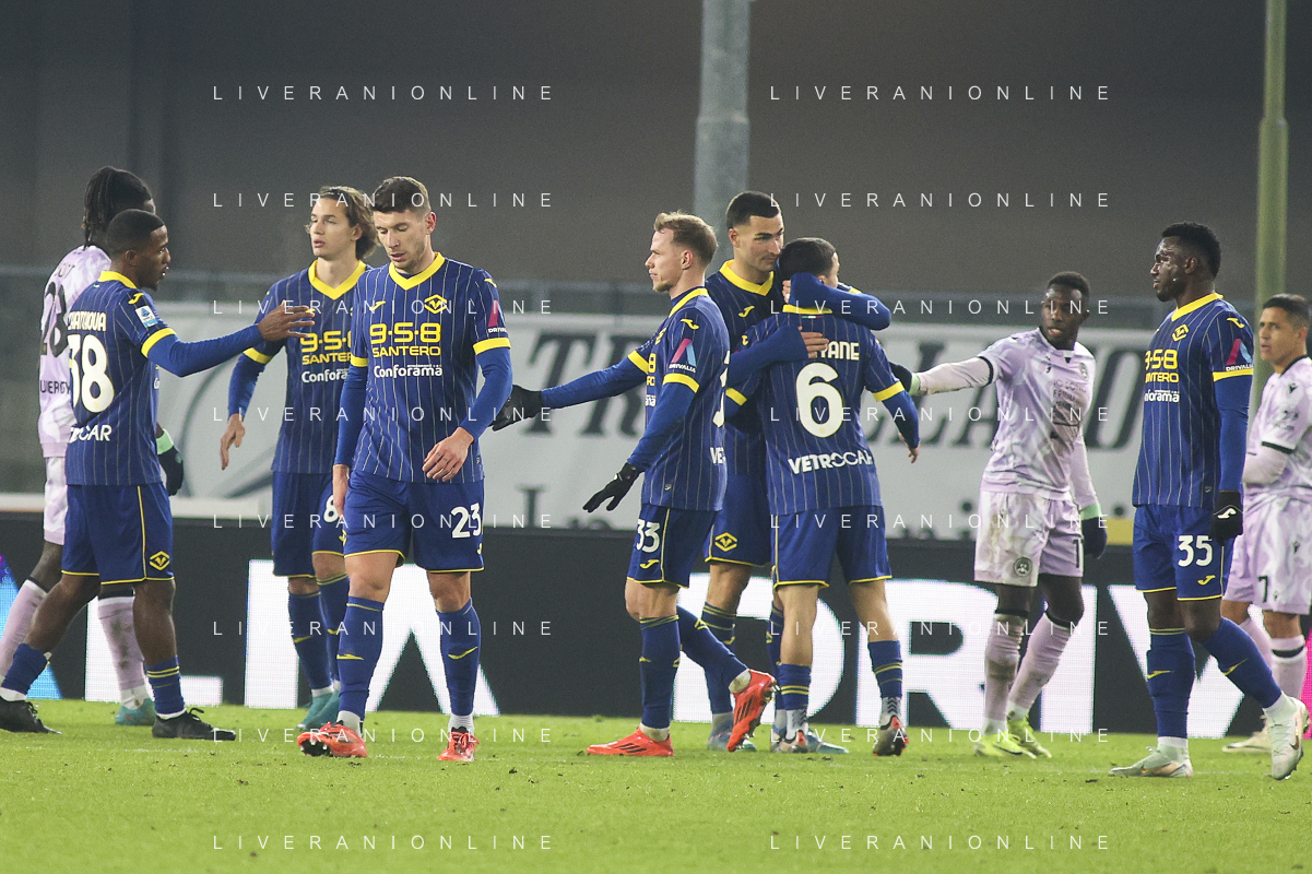 Hellas Verona players hugs during Hellas Verona FC vs Udinese Calcio, 19° Serie A Enilive 2024-25 game at Marcantonio Bentegodi stadium in Verona (VR), Italy, on January 04, 2025. (Photo by Davide Casentini)-AGENZIA ALDO LIVERANI SAS