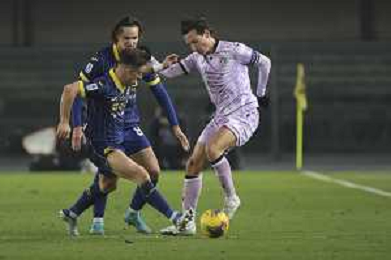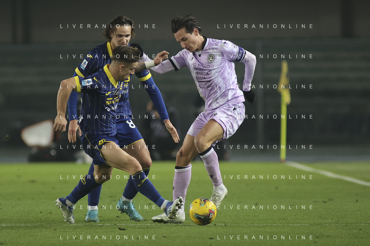 Florian Thauvin of Udinese FC battle for the ball with Tomas Suslov of Hellas Verona FC and Daniele Ghilardi of Hellas Verona FC during Hellas Verona FC vs Udinese Calcio, 19° Serie A Enilive 2024-25 game at Marcantonio Bentegodi stadium in Verona (VR), Italy, on January 04, 2025. (Photo by Davide Casentini)-AGENZIA ALDO LIVERANI SAS