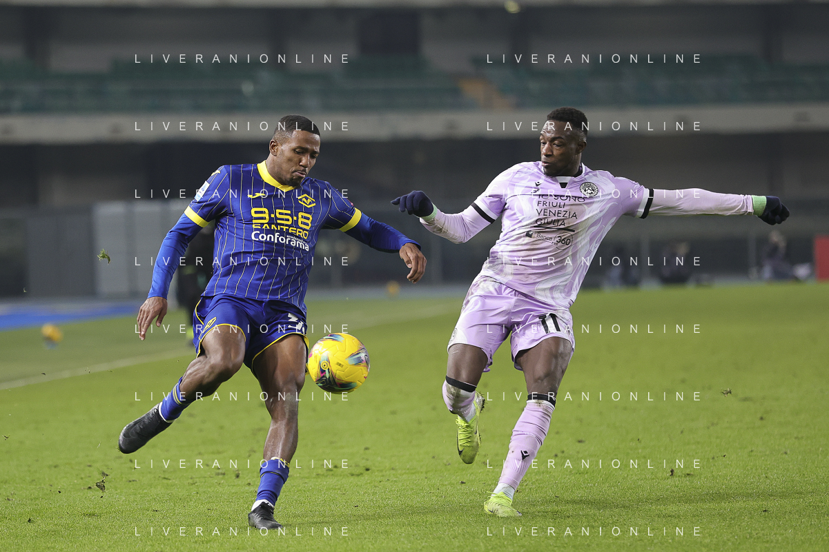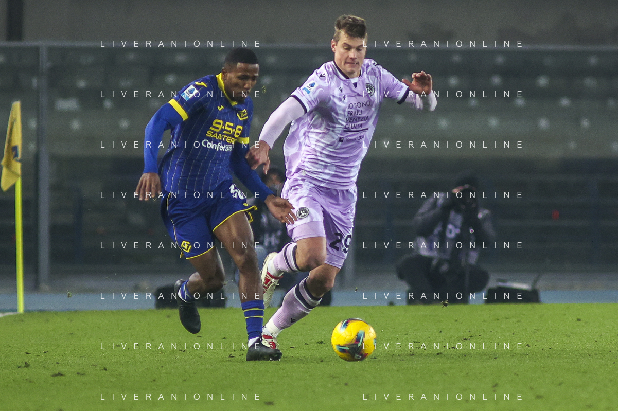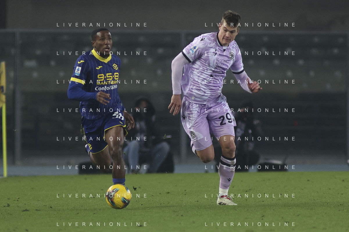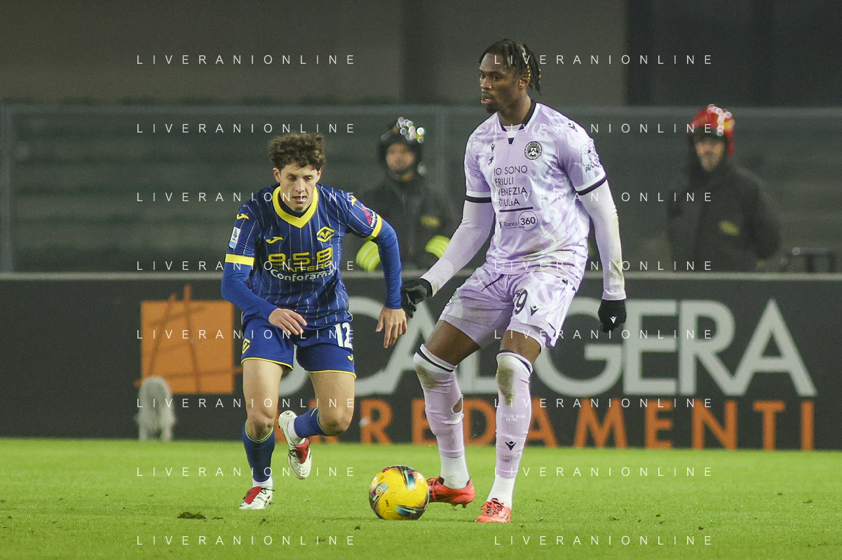Jackson Tchatchoua of Hellas Verona FC battle for the ball with Jaka Bijol of Udinese FC during Hellas Verona FC vs Udinese Calcio, 19° Serie A Enilive 2024-25 game at Marcantonio Bentegodi stadium in Verona (VR), Italy, on January 04, 2025. (Photo by Davide Casentini)-AGENZIA ALDO LIVERANI SAS
