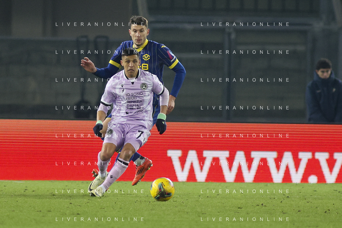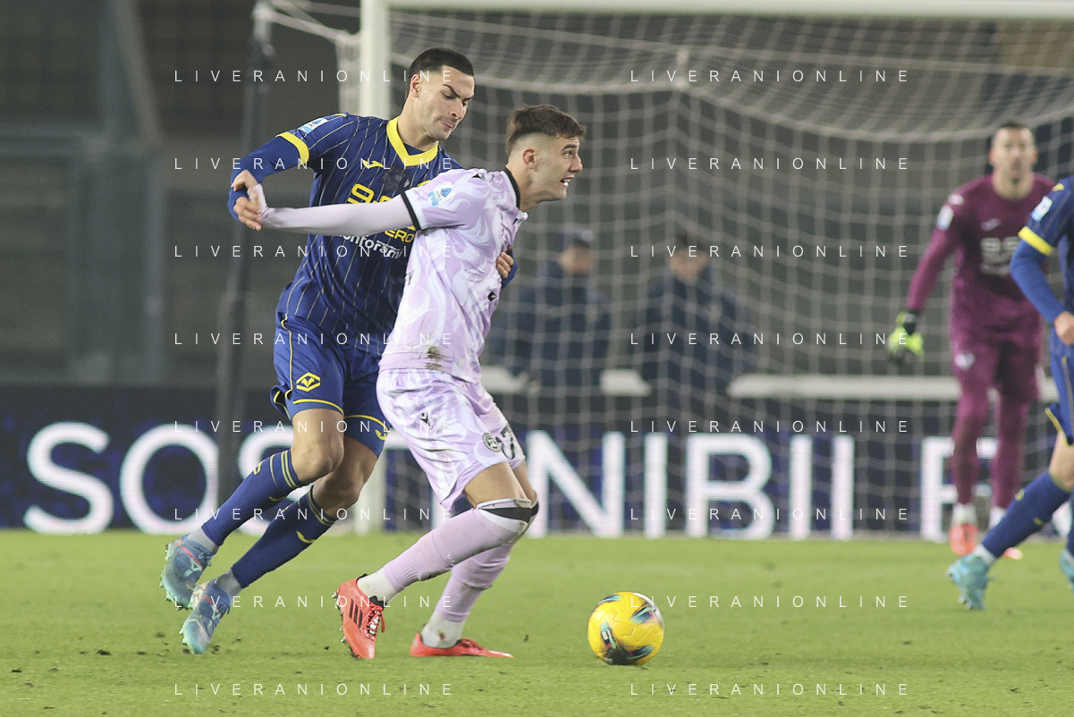 Lorenzo Lucca of Udinese FC battle for the ball with Diego Coppola of Hellas Verona FC during Hellas Verona FC vs Udinese Calcio, 19° Serie A Enilive 2024-25 game at Marcantonio Bentegodi stadium in Verona (VR), Italy, on January 04, 2025. (Photo by Davide Casentini)-AGENZIA ALDO LIVERANI SAS