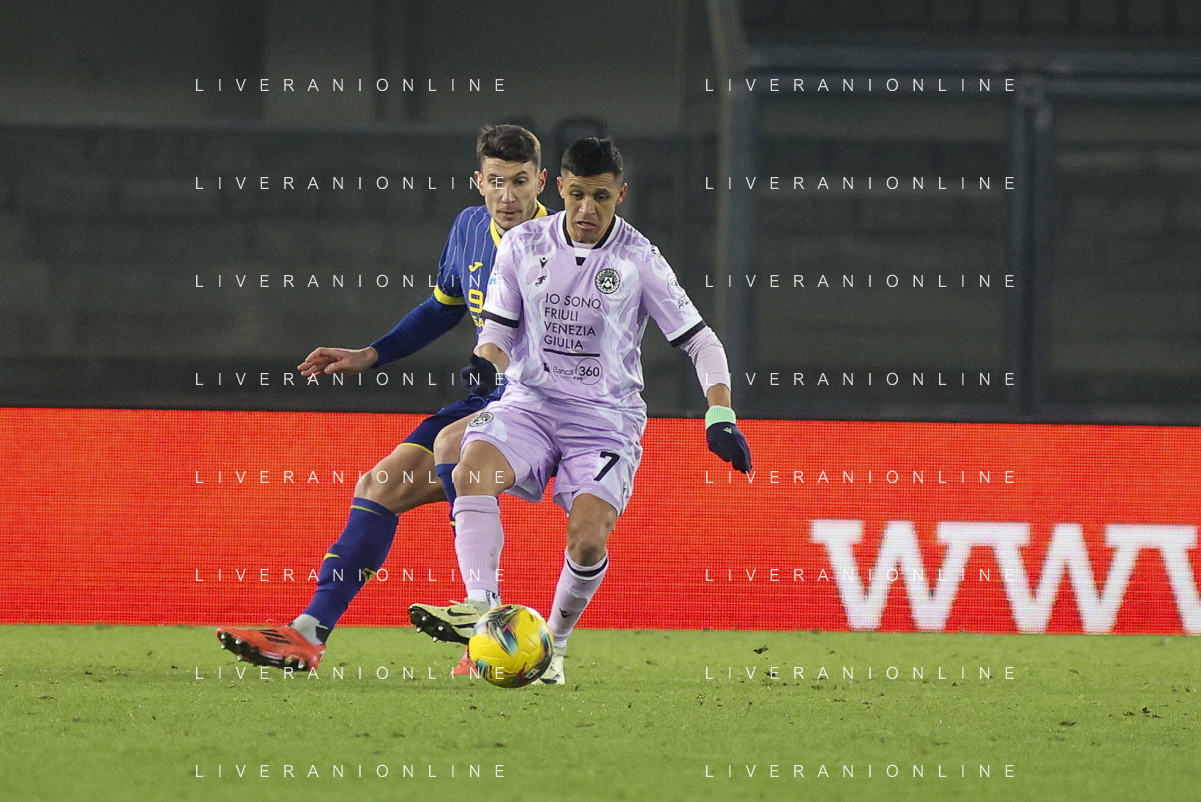 Alexis Sanchez of Udinese FC battle for the ball with Giangiacomo Magnani of Hellas Verona FC during Hellas Verona FC vs Udinese Calcio, 19° Serie A Enilive 2024-25 game at Marcantonio Bentegodi stadium in Verona (VR), Italy, on January 04, 2025. (Photo by Davide Casentini)- AGENZIA ALDO LIVERANI SAS