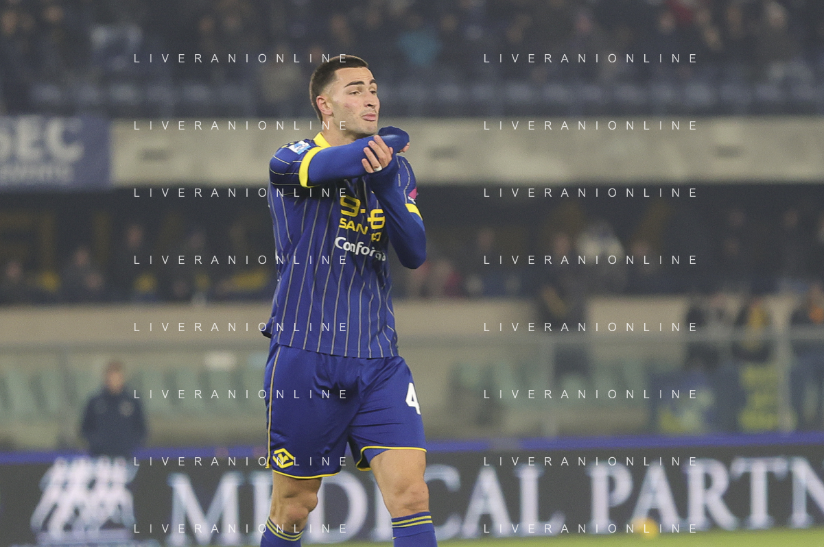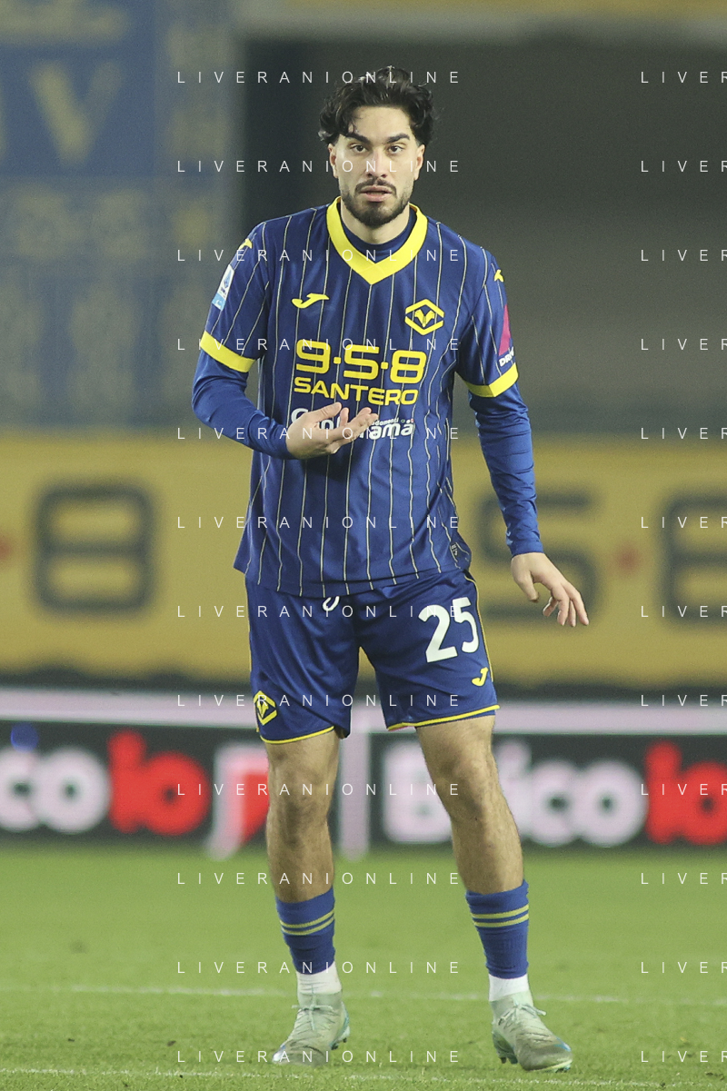 Diego Coppola of Hellas Verona FC gestures during Hellas Verona FC vs Udinese Calcio, 19° Serie A Enilive 2024-25 game at Marcantonio Bentegodi stadium in Verona (VR), Italy, on January 04, 2025. (Photo by Davide Casentini)-AGENZIA ALDO LIVERANI SAS