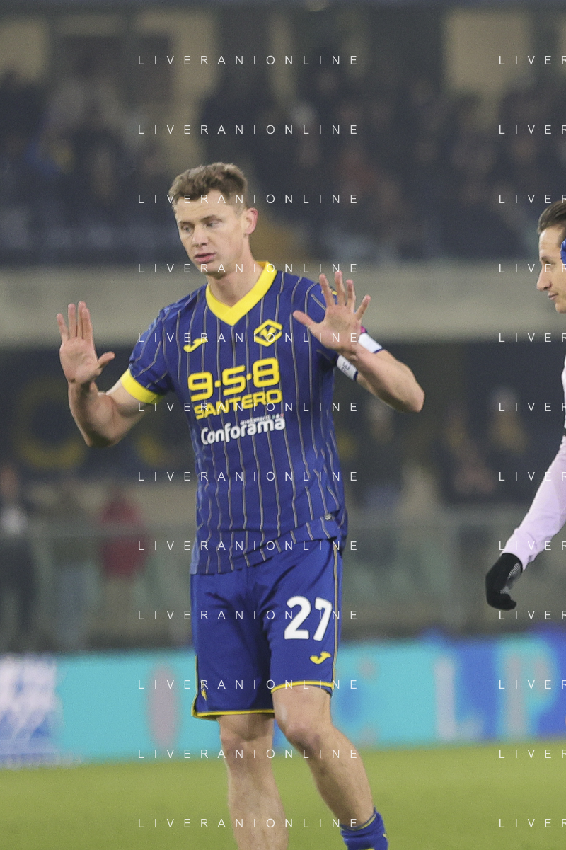 Pawel Dawidowicz of Hellas Verona FC gestures during Hellas Verona FC vs Udinese Calcio, 19° Serie A Enilive 2024-25 game at Marcantonio Bentegodi stadium in Verona (VR), Italy, on January 04, 2025. (Photo by Davide Casentini)-AGENZIA ALDO LIVERANI SAS