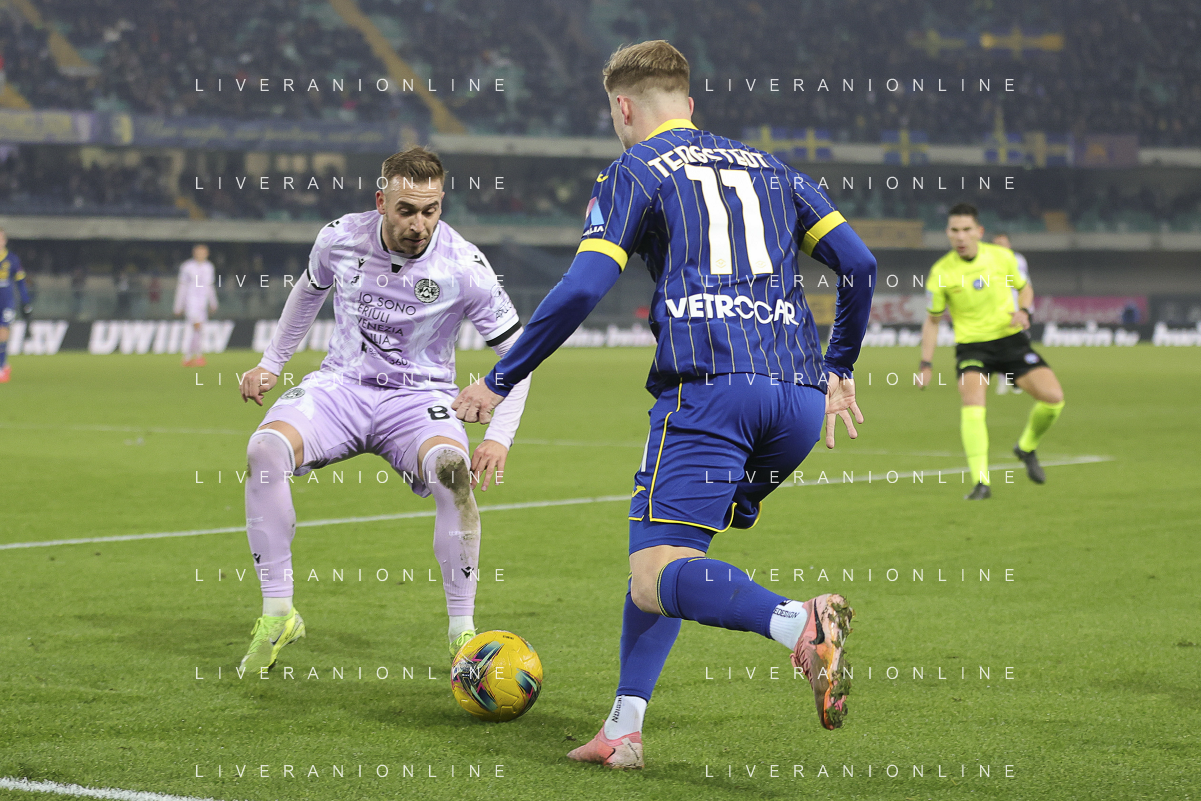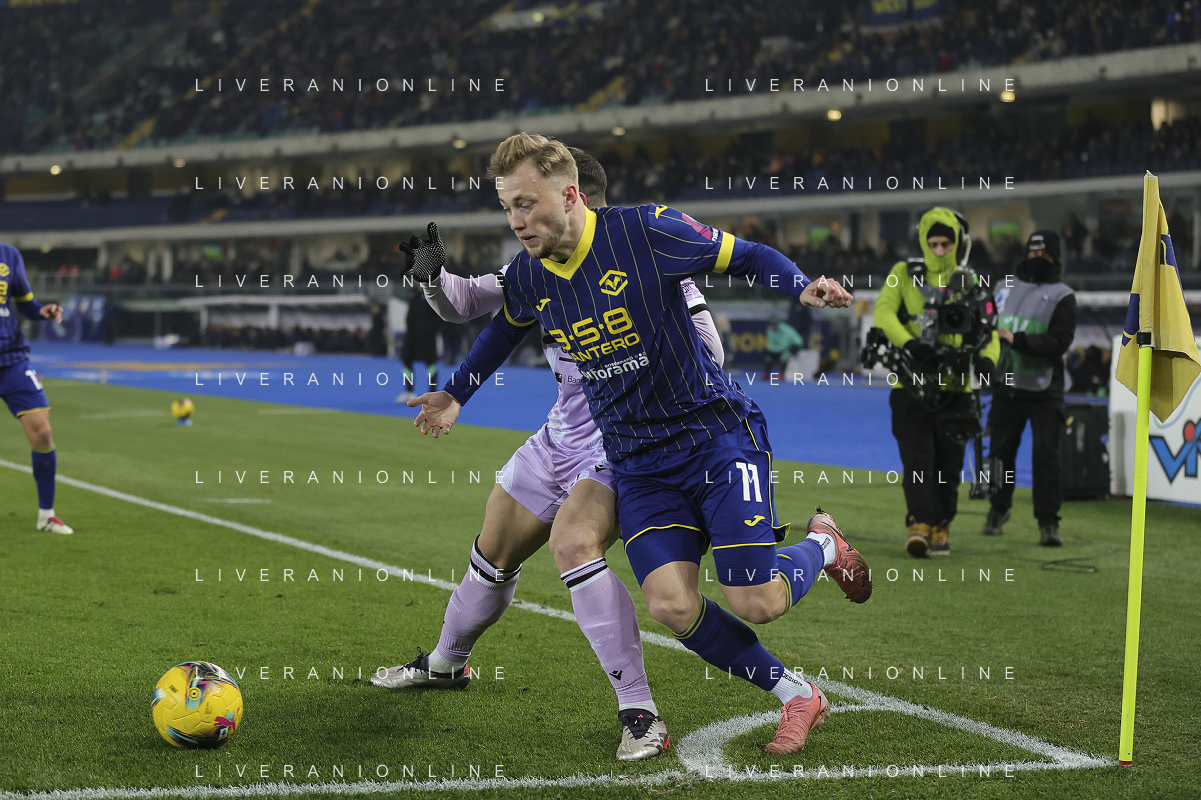 Casper Tengstedt of Hellas Verona FC competes for the ball with Sandi Lovrič of Udinese FC during Hellas Verona FC vs Udinese Calcio, 19° Serie A Enilive 2024-25 game at Marcantonio Bentegodi stadium in Verona (VR), Italy, on January 04, 2025. (Photo by Davide Casentini)-AGENZIA ALDO LIVERANI SAS