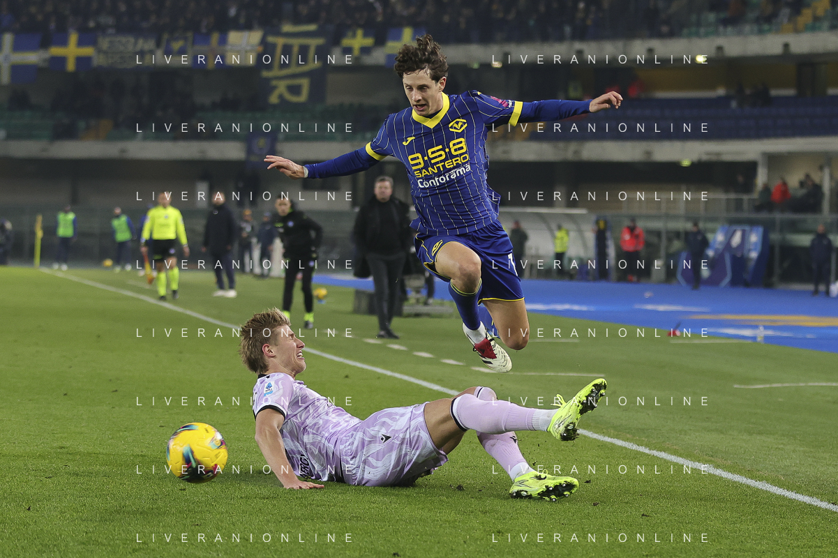 Domagoj Bradaric of Hellas Verona FC battle for the ball with Thomas Thiesson Kristensen of Udinese FC during Hellas Verona FC vs Udinese Calcio, 19° Serie A Enilive 2024-25 game at Marcantonio Bentegodi stadium in Verona (VR), Italy, on January 04, 2025. (Photo by Davide Casentini)-AGENZIA ALDO LIVERANI SAS