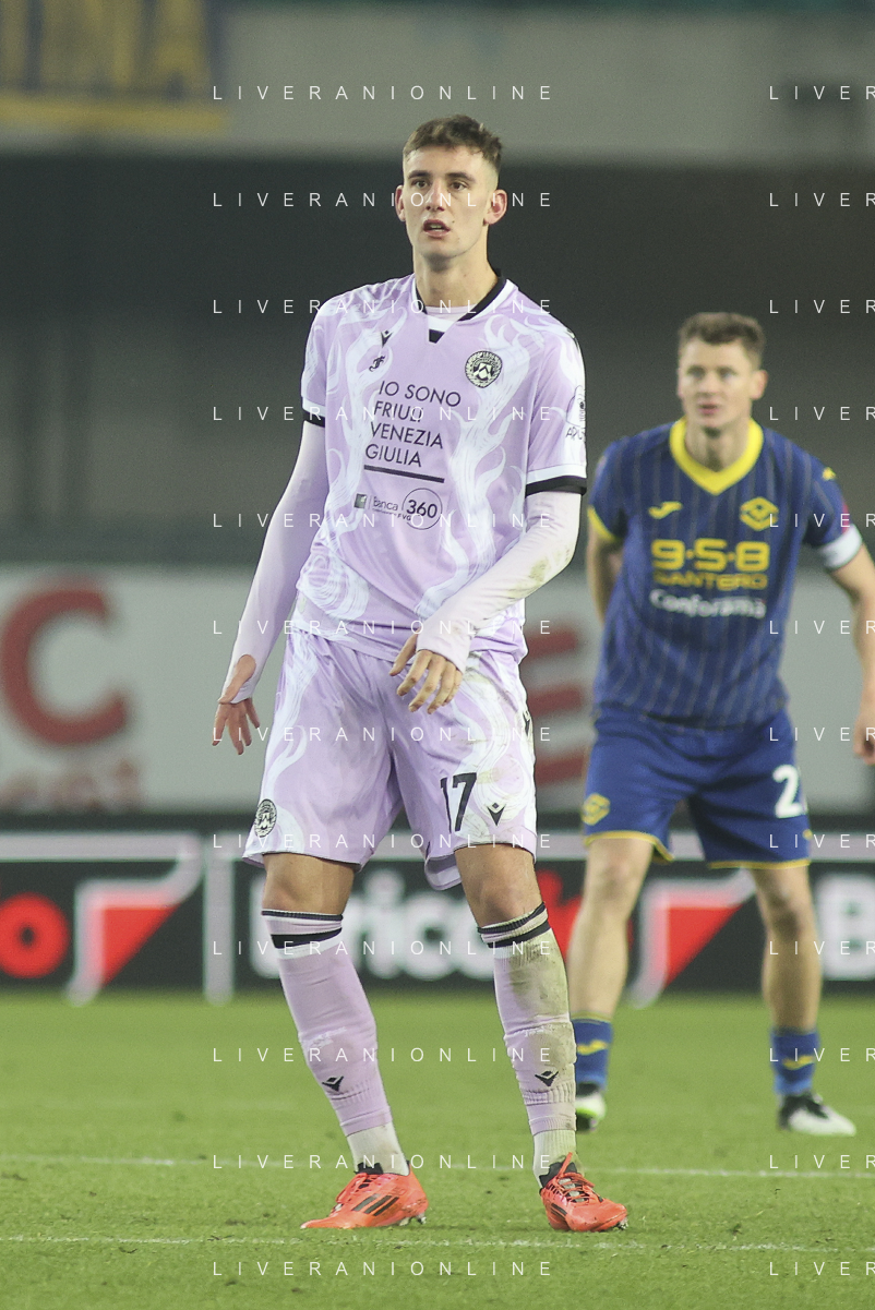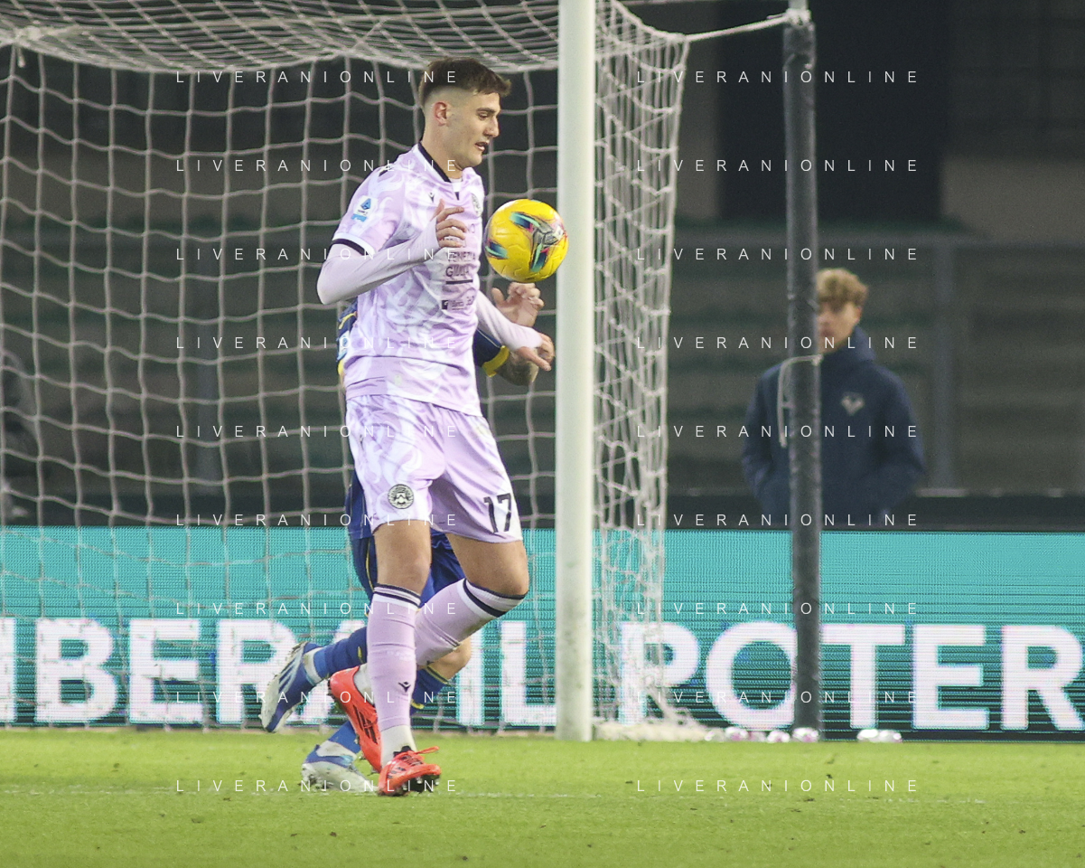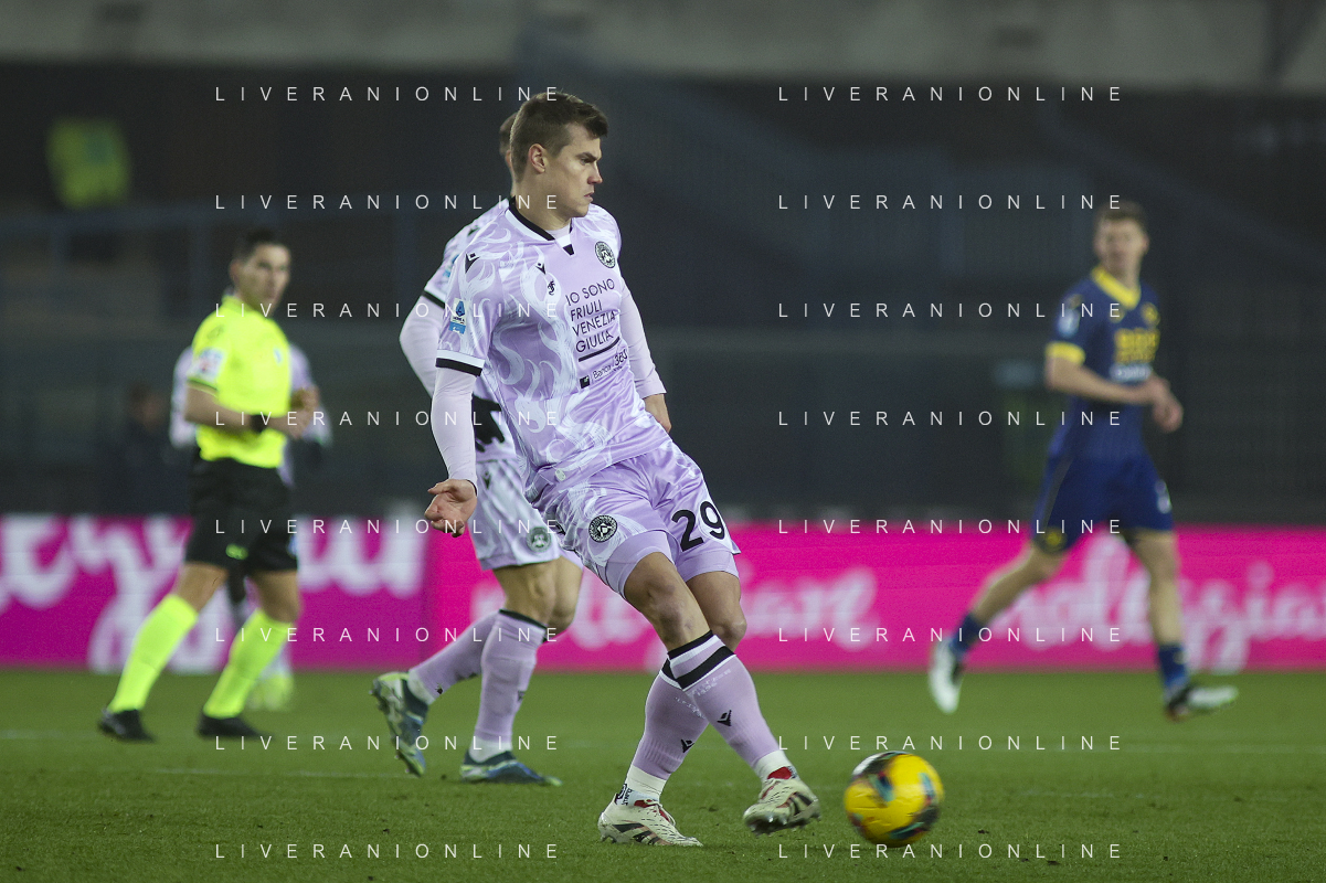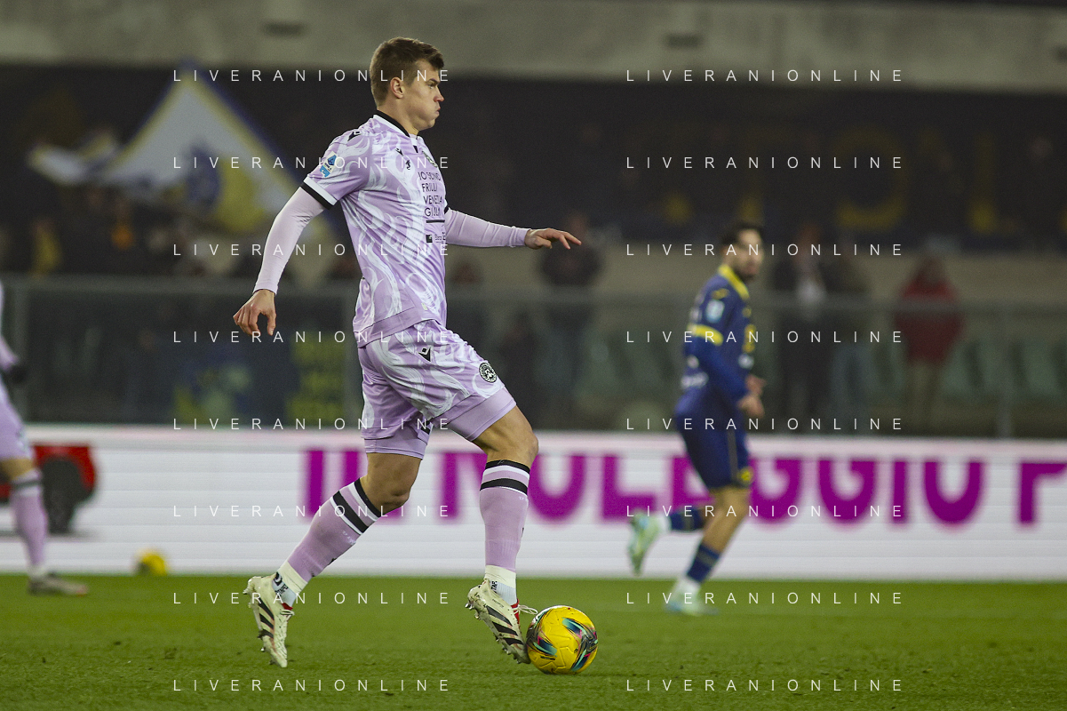 Jaka Bijol of Udinese FC play the ball during Hellas Verona FC vs Udinese Calcio, 19° Serie A Enilive 2024-25 game at Marcantonio Bentegodi stadium in Verona (VR), Italy, on January 04, 2025. (Photo by Davide Casentini)-AGENZIA ALDO LIVERANI SAS