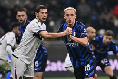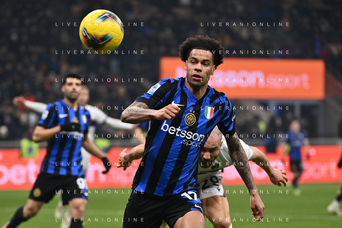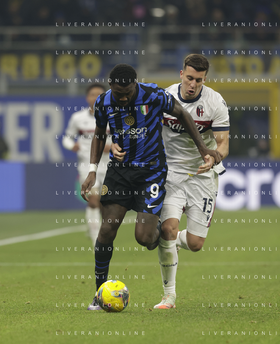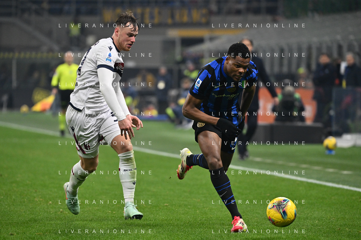 Inter vs Bologna nella foto Sam Beukema (Bologna) e Denzel Dumfries (Inter) Milano 15-01-2025 Stadio Giuseppe Meazza - San Siro Campionato Serie A Enilive - recupero 19a giornata foto Roberto Garavaglia/Agenzia Aldo Liverani sas
