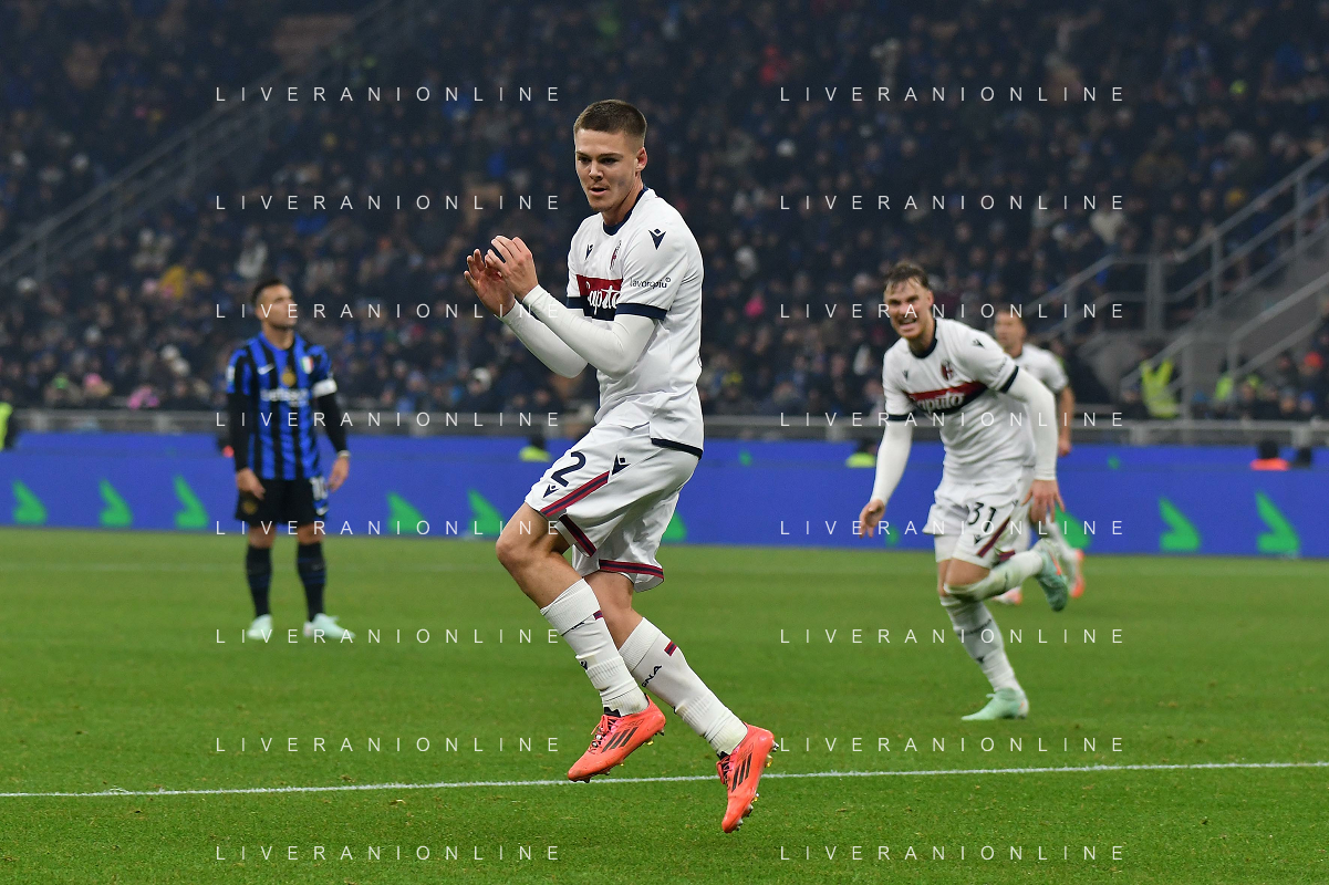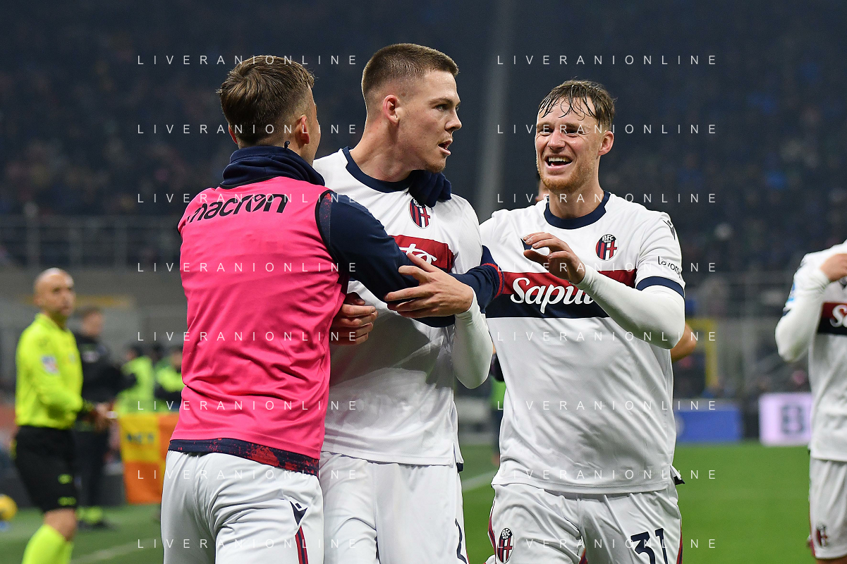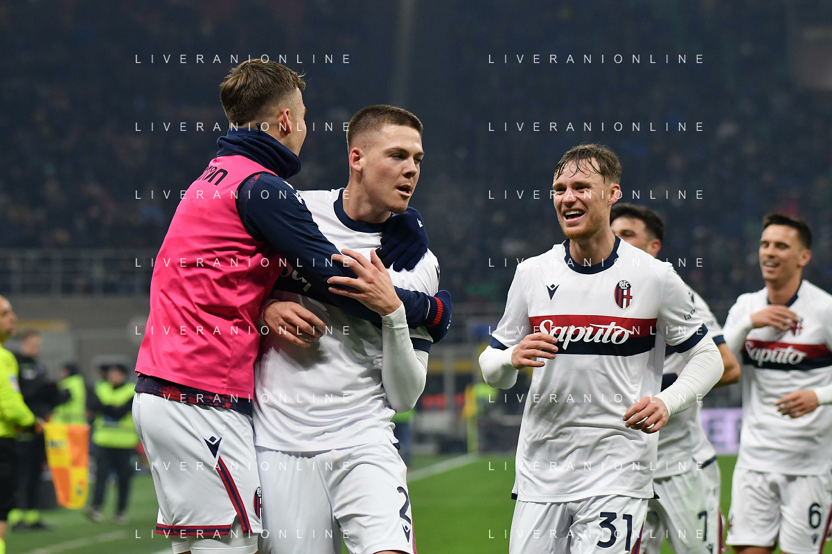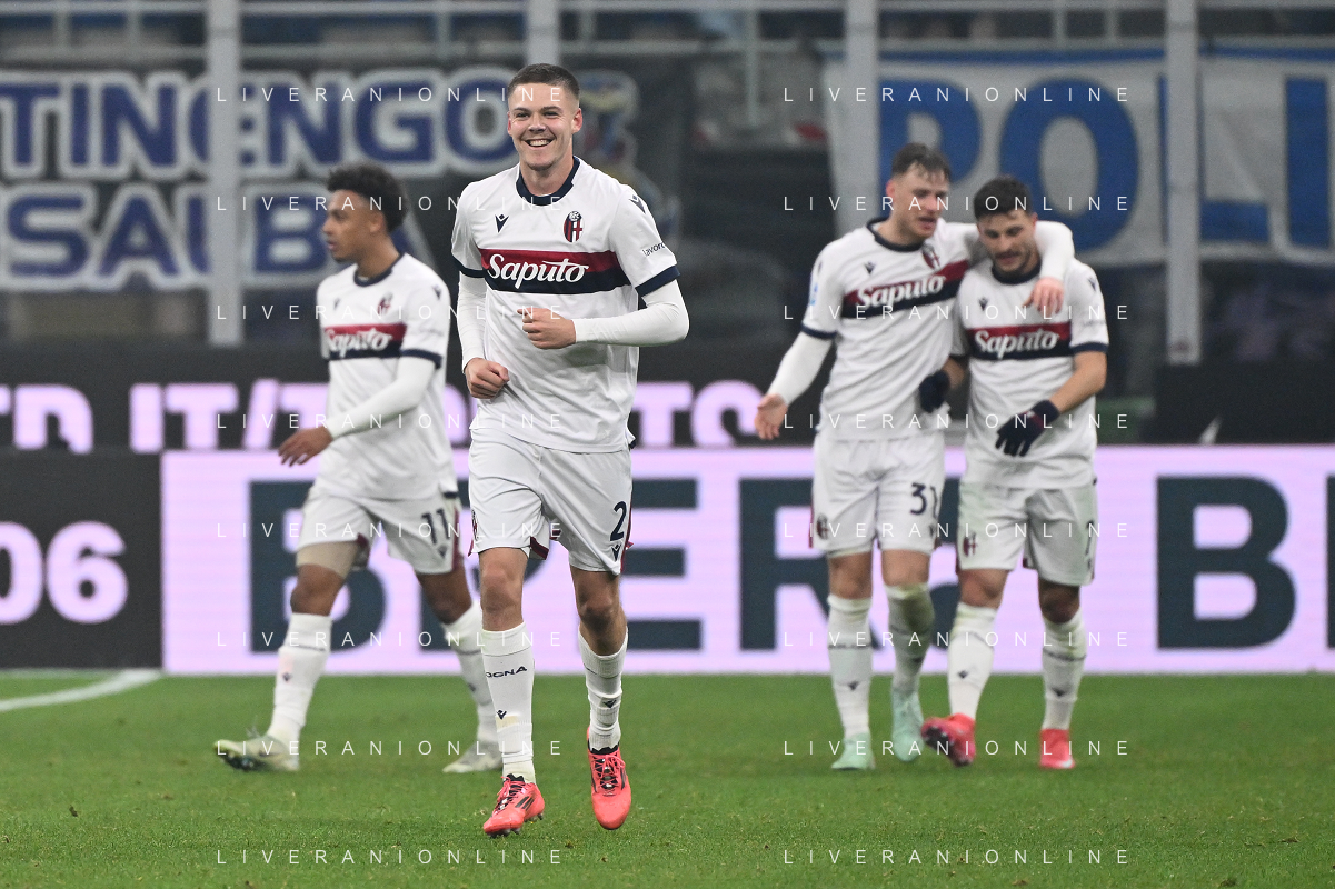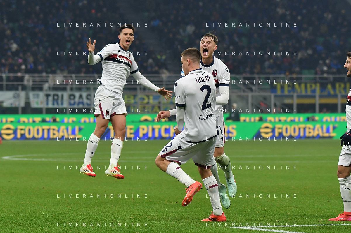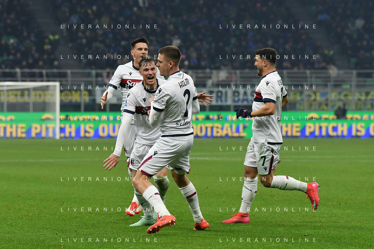 Inter vs Bologna nella foto Emil Holm (Bologna) esultanza dopo il gol del 2 a 2 Milano 15-01-2025 Stadio Giuseppe Meazza - San Siro Campionato Serie A Enilive - recupero 19a giornata foto Roberto Garavaglia/Agenzia Aldo Liverani sas