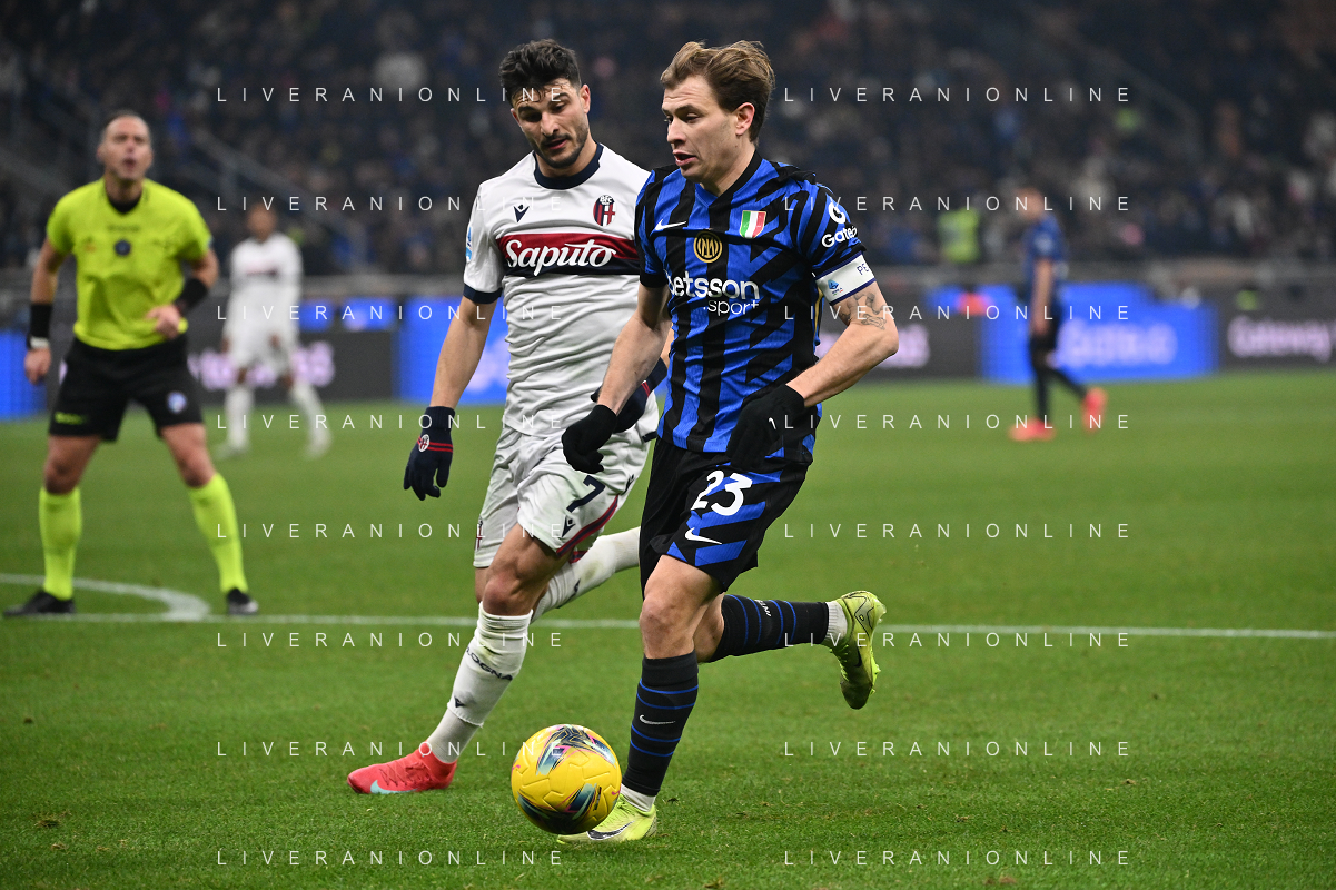 Inter vs Bologna nella foto Riccardo Orsolini (Bologna) e Nicolò Barella (Inter) Milano 15-01-2025 Stadio Giuseppe Meazza - San Siro Campionato Serie A Enilive - recupero 19a giornata foto Roberto Garavaglia/Agenzia Aldo Liverani sas