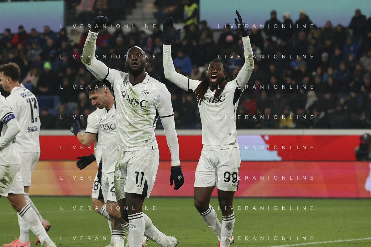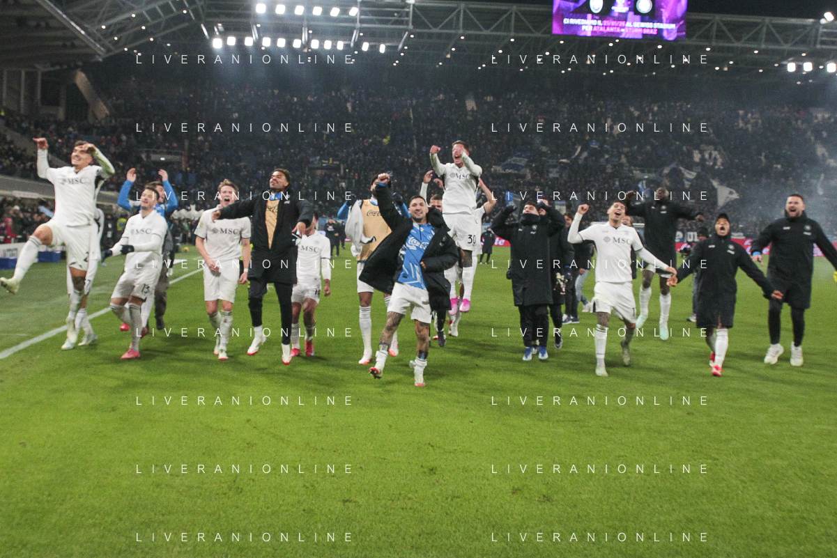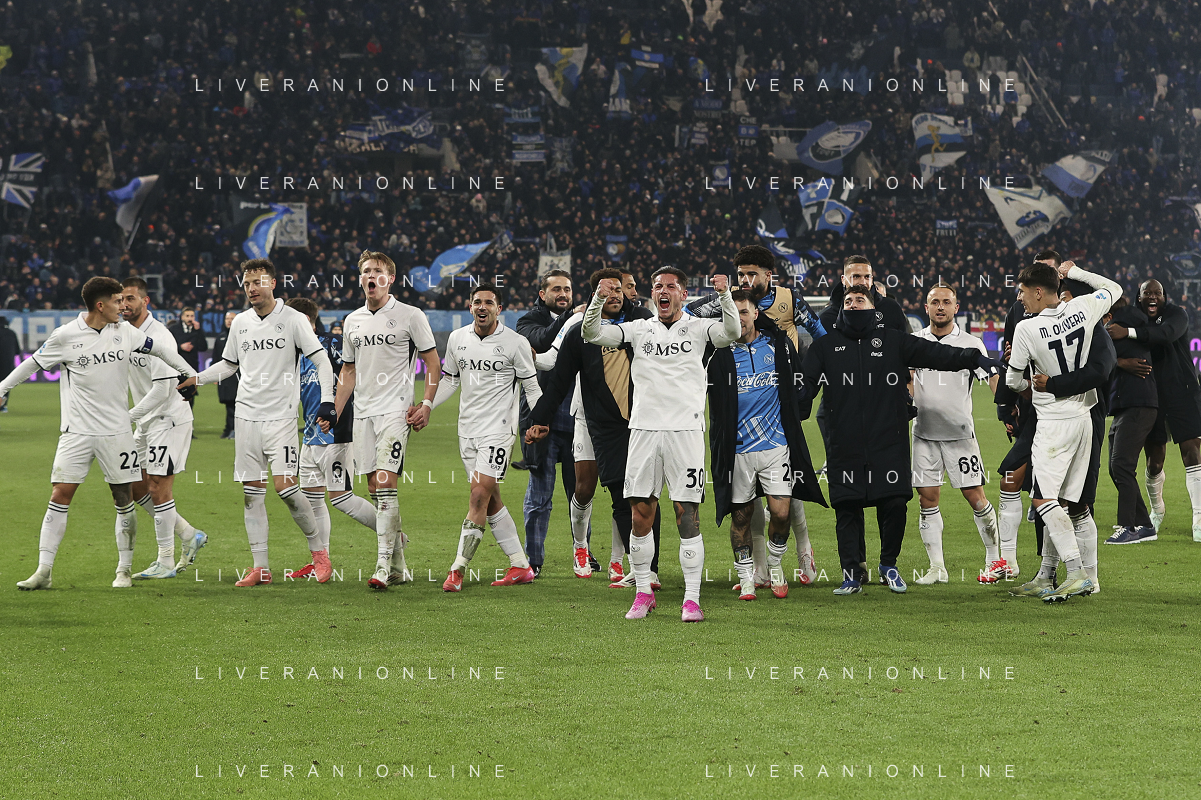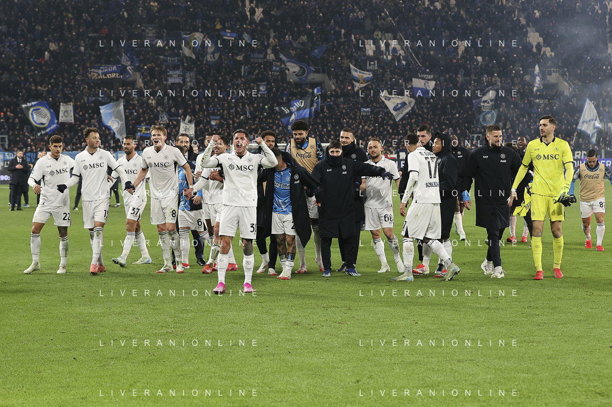 napoli players celebrate the victory at the end of Atalanta BC vs SSC Napoli, 21° Serie A Enilive 2024-25 game at Gewiss stadium in Bergamo (BG), Italy, on January 18, 2025. (Photo by Davide Casentini)-AGENZIA ALDO LIVERANI SAS