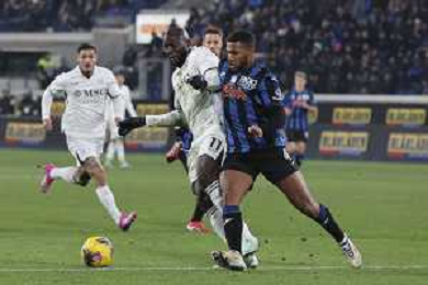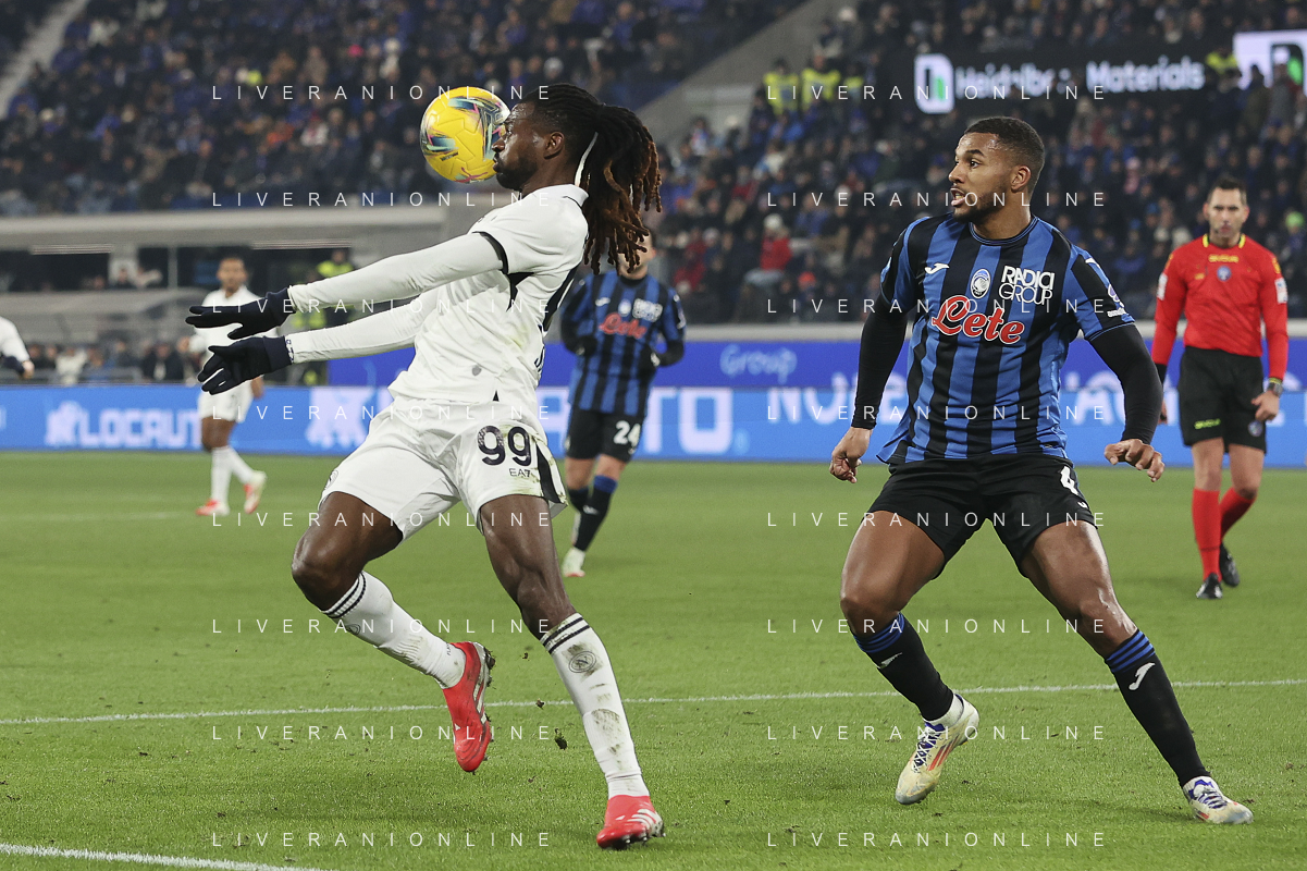 Andre’-Frank Zambo Anguissa of SSC Napoli competes for the ball with Isak Hien of Atalanta BC during Atalanta BC vs SSC Napoli, 21° Serie A Enilive 2024-25 game at Gewiss stadium in Bergamo (BG), Italy, on January 18, 2025. (Photo by Davide Casentini)-AGENZIA ALDO LIVERANI SAS
