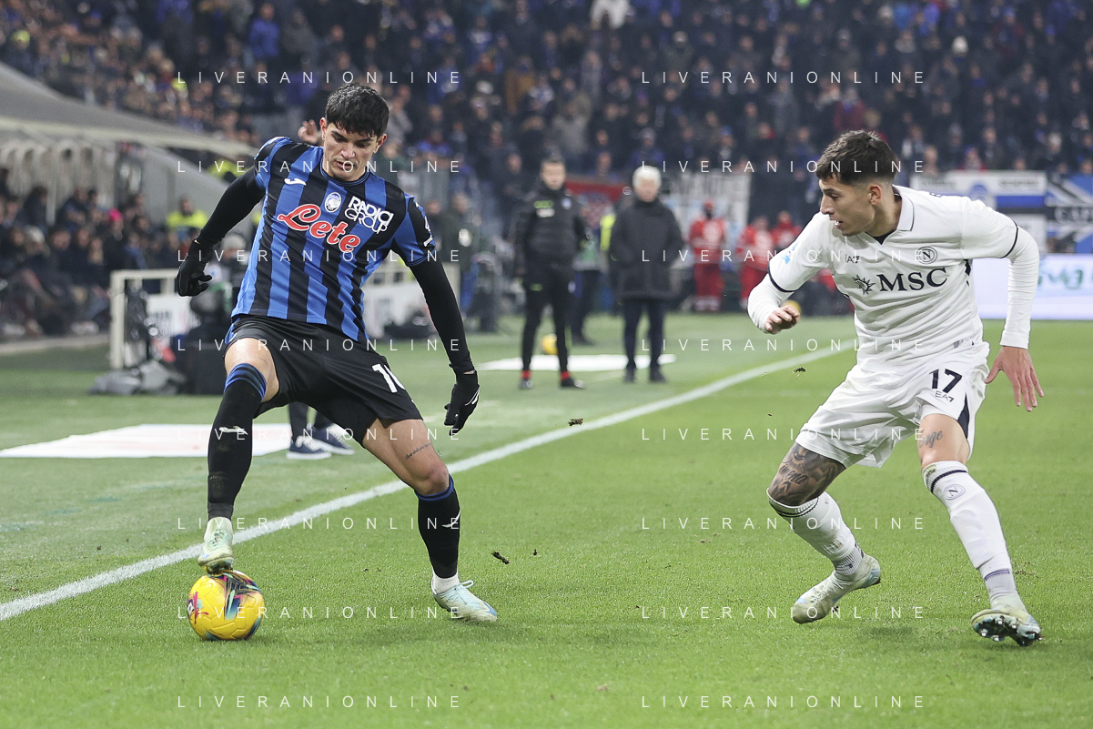 Raul Bellanova of Atalanta BC competes for the ball with Mathias Olivera of SSC Napoli during Atalanta BC vs SSC Napoli, 21° Serie A Enilive 2024-25 game at Gewiss stadium in Bergamo (BG), Italy, on January 18, 2025. (Photo by Davide Casentini)-AGENZIA ALDO LIVERANI SAS