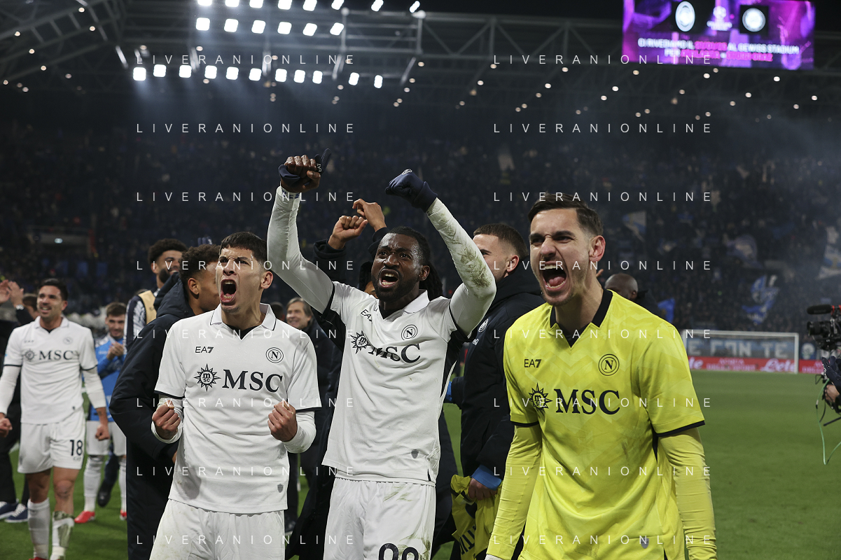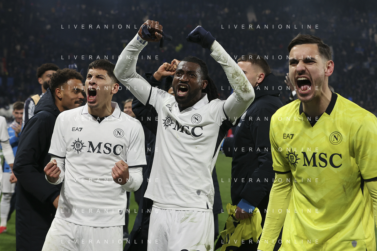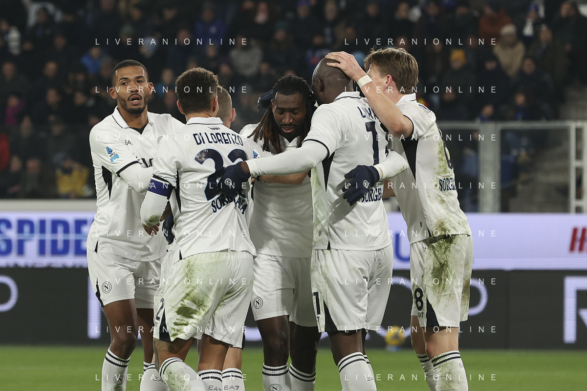 Mathias Olivera of SSC Napoli, Andrè-Frank Zambo Anguissa of SSC Napoli, Alex Meret of SSC Napoli celebrate the victory at the end of Atalanta BC vs SSC Napoli, 21° Serie A Enilive 2024-25 game at Gewiss stadium in Bergamo (BG), Italy, on January 18, 2025. (Photo by Davide Casentini)-AGENZIA ALDO LIVERANI SAS