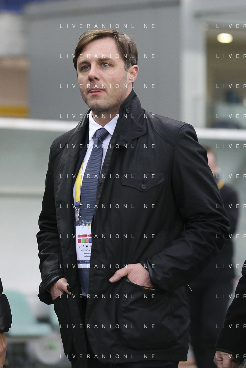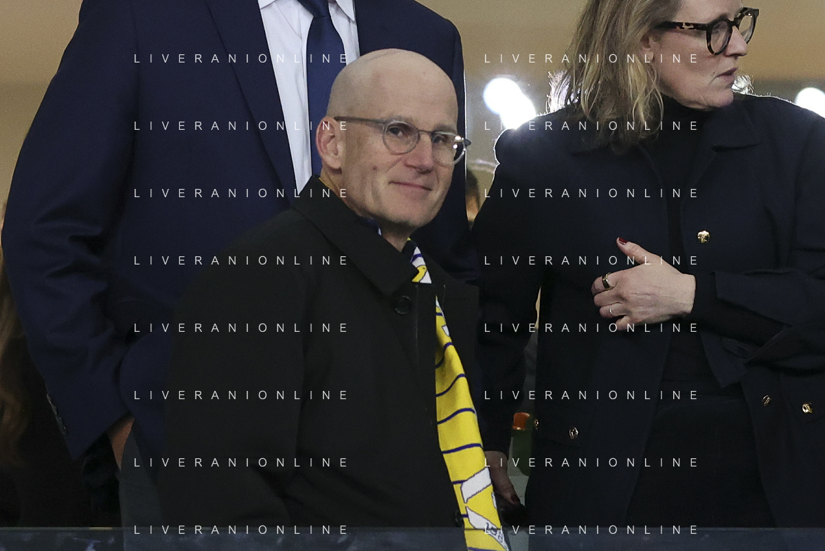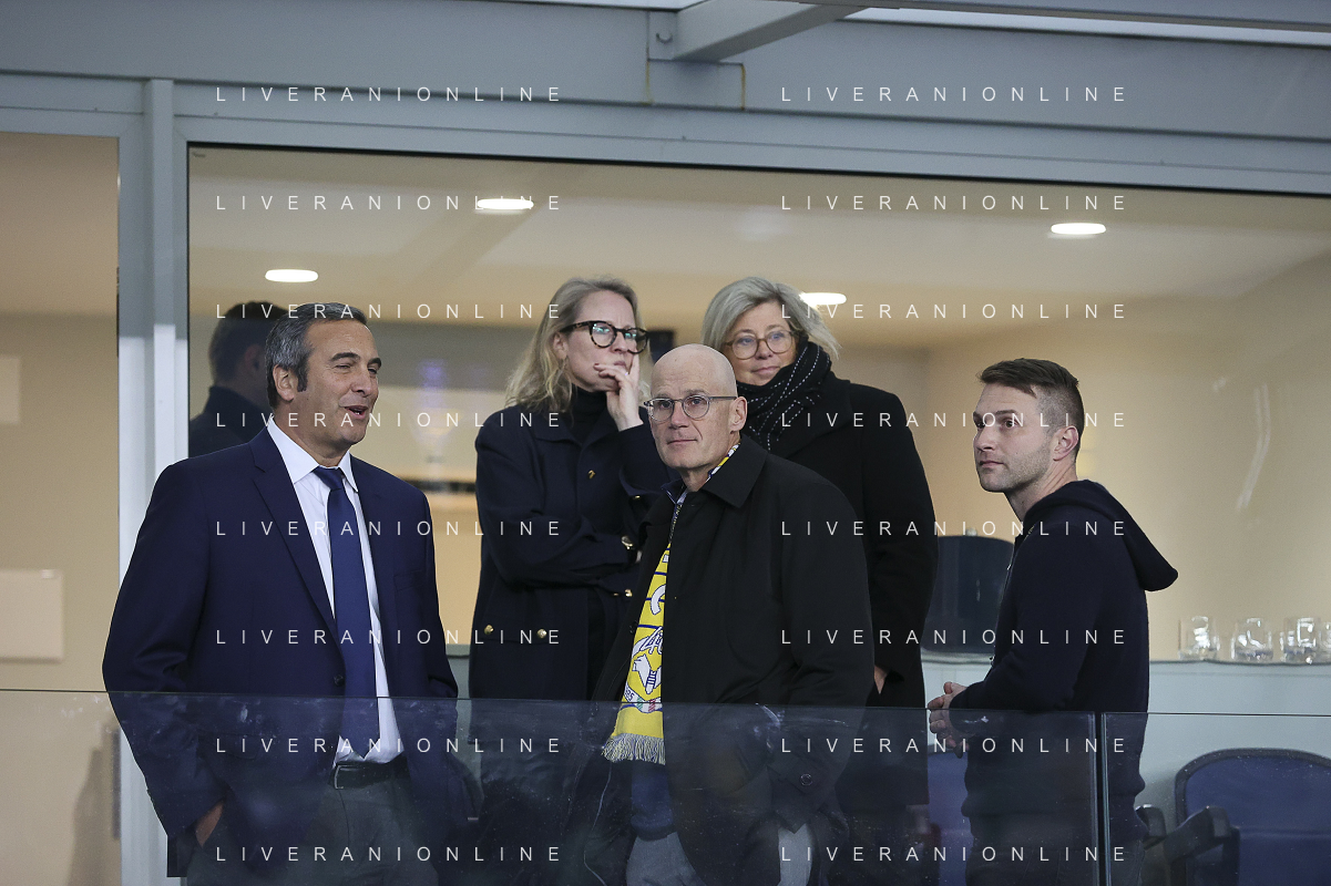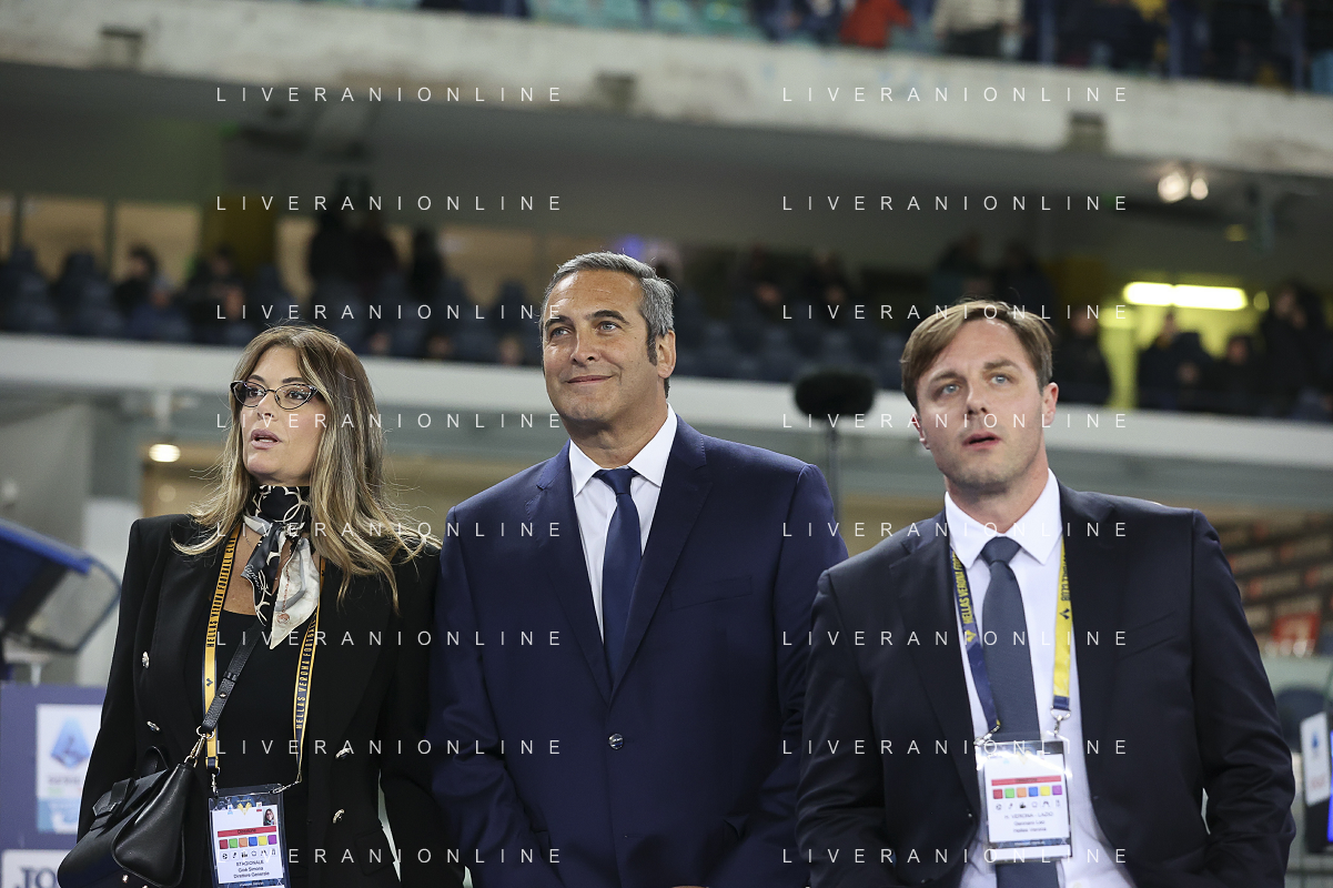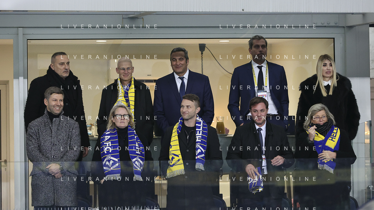 in the first line from left to right: Maurizio Setti Senior Advisor of Football Operations of Hellas Verona FC, Thomas Hitzlsperger Member of Executive Board of Hellas Verona, Donata Hopfen Member of Executive Board of Hellas Verona, Dirk Swaneveld Member of Executive Board of Hellas Verona,Gennaro Leo Vice General Director of Hellas Verona and Isabella Thun Member of Executive Board of Hellas Verona; in second line: Maurizio Setti Senior Advisor of Football Operations of Hellas Verona FC, Christian Puscasiu Member of Executive Board of Hellas Verona, Italo Zanzi Ceo of Hellas Verona FC and Sean Foley manager of Hellas Verona FC during Hellas Verona FC vs SS Lazio, 21° Serie A Enilive 2024-25 game at Marcantonio Bentegodi stadium in Verona (VR), Italy, on January 19, 2025. (Photo by Davide Casentini)- AGENZIA ALDO LIVERANI SAS