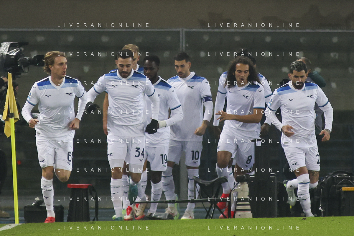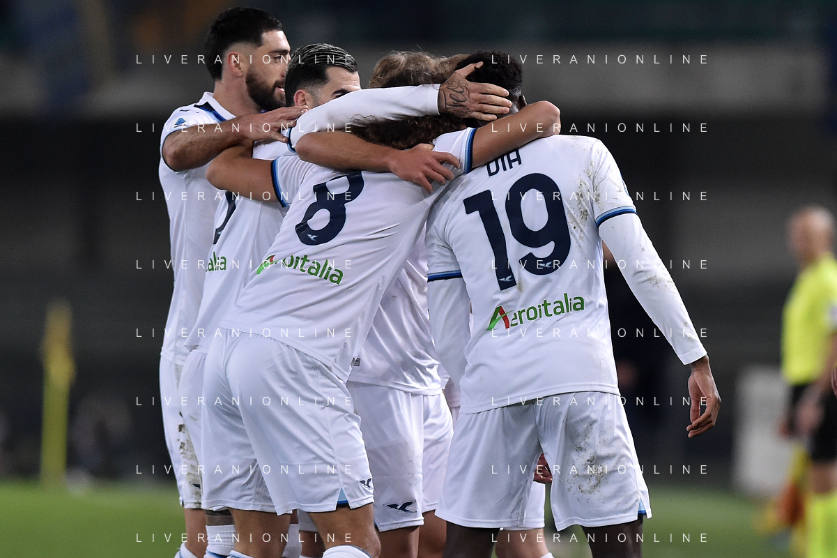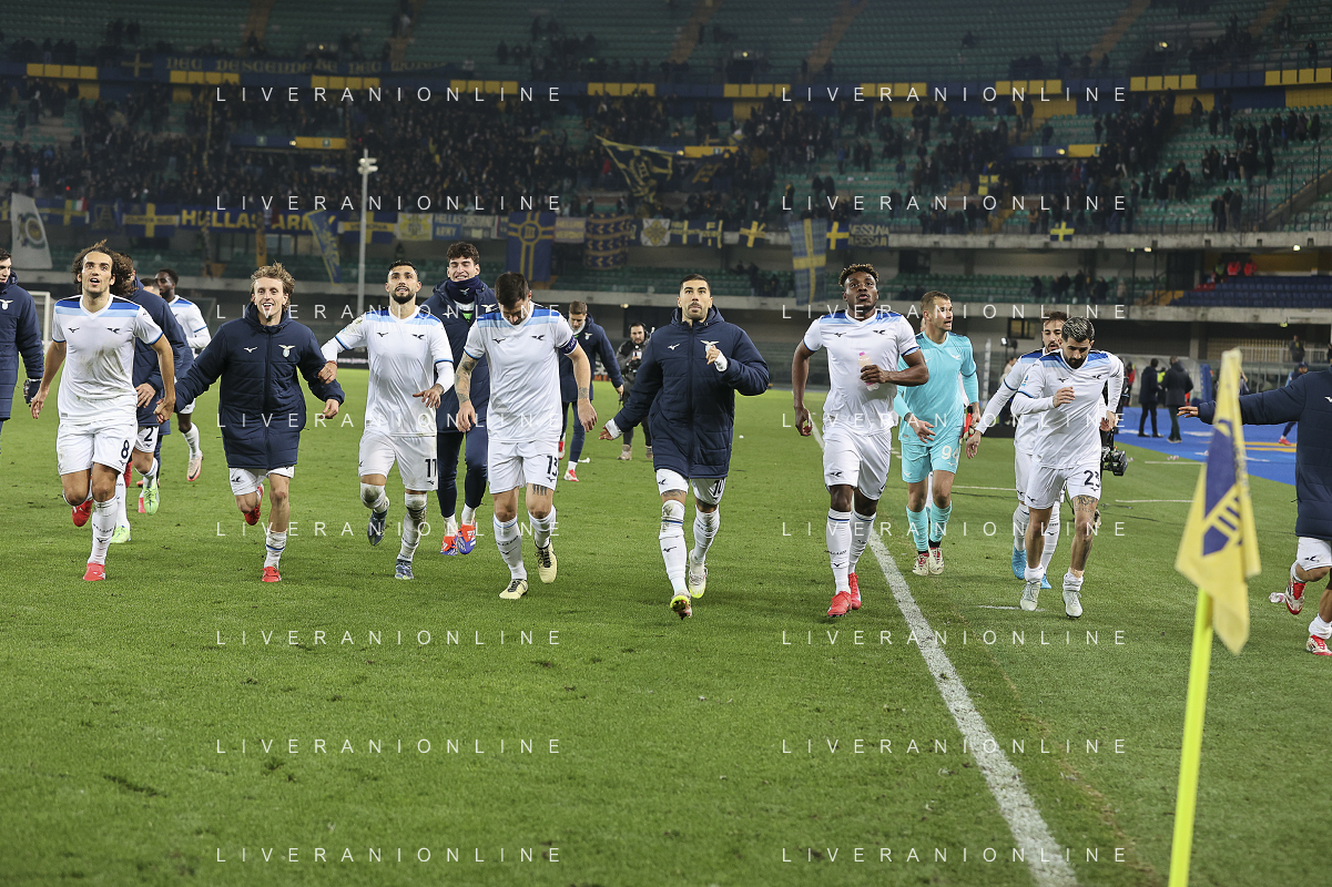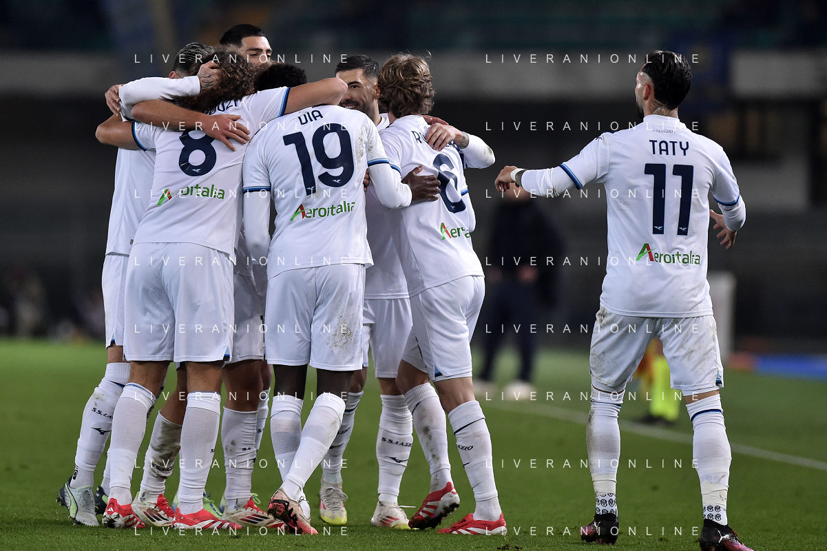 Lazio players celebrate the victory at the end of Hellas Verona FC vs SS Lazio, 21° Serie A Enilive 2024-25 game at Marcantonio Bentegodi stadium in Verona (VR), Italy, on January 19, 2025. (Photo by Davide Casentini) - AGENZIA ALDO LIVERANI SAS