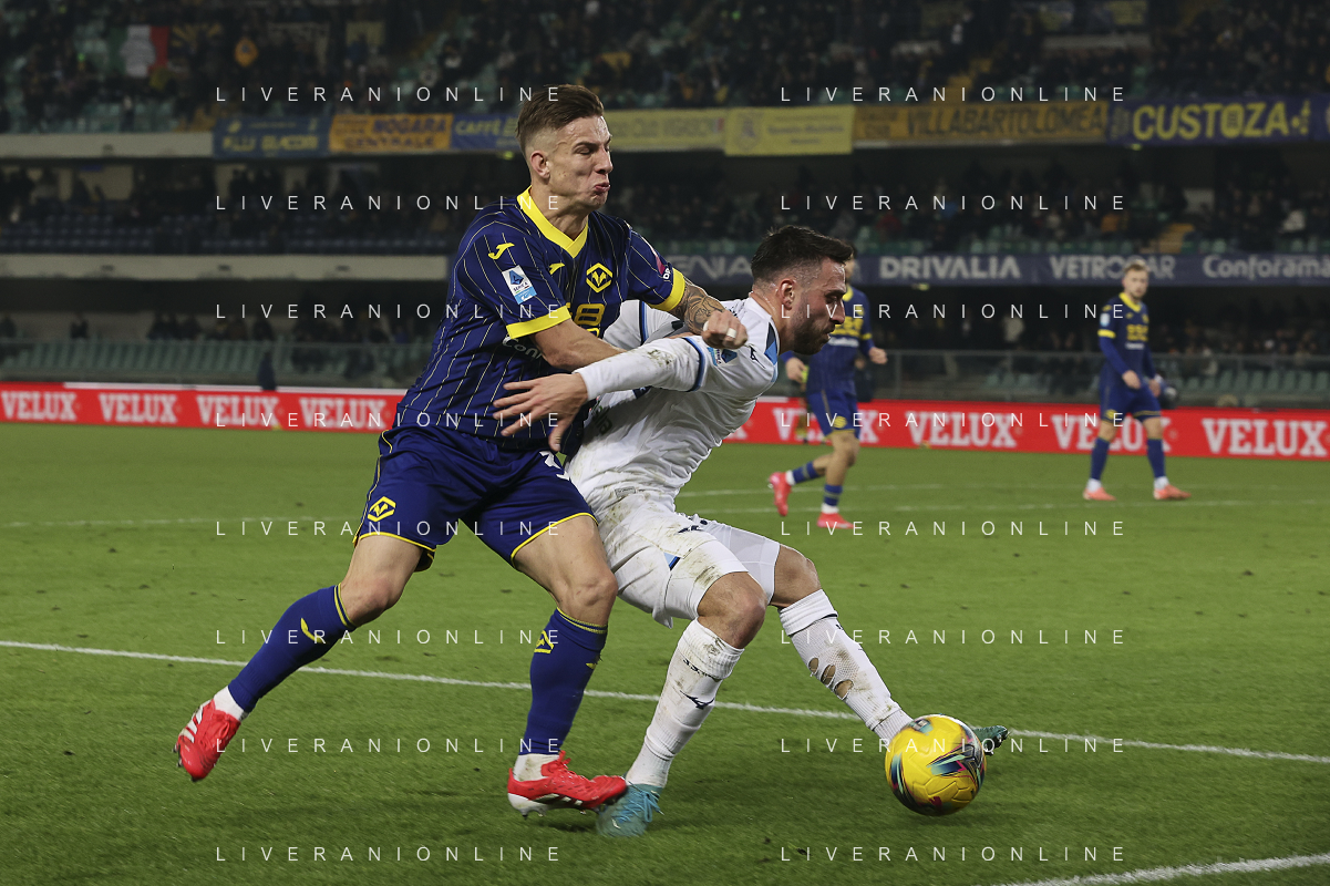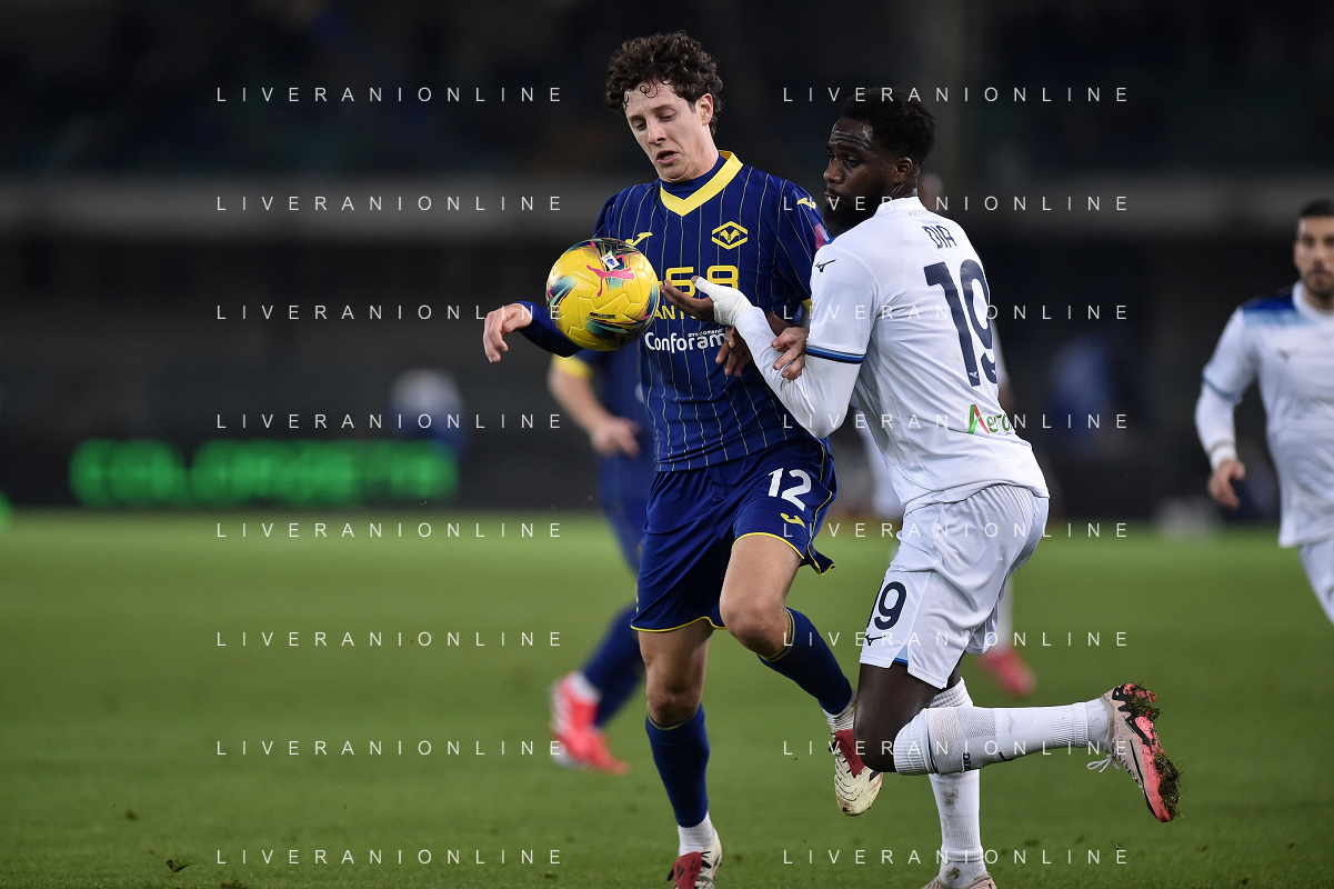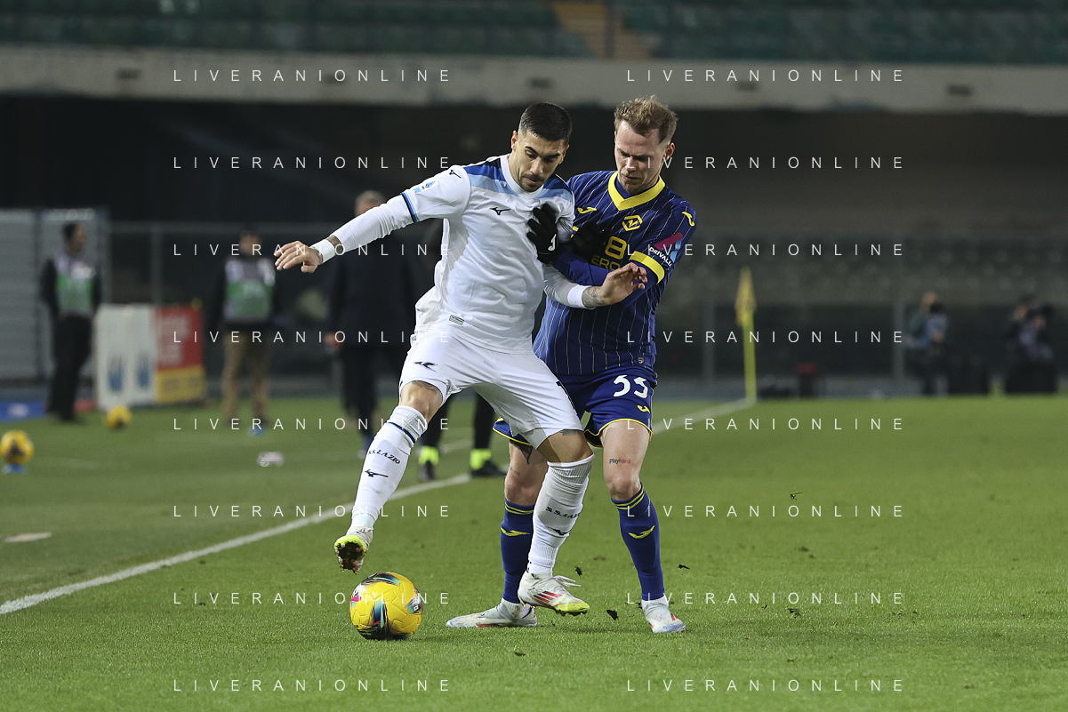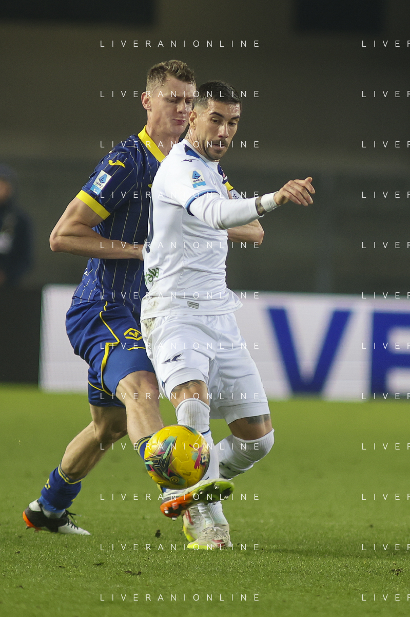 Mattia Zaccagni of SS Lazio battle for the ball with Diego Coppola of Hellas Verona FC during Hellas Verona FC vs SS Lazio, 21° Serie A Enilive 2024-25 game at Marcantonio Bentegodi stadium in Verona (VR), Italy, on January 19, 2025. (Photo by Davide Casentini) - AGENZIA ALDO LIVERANI SAS