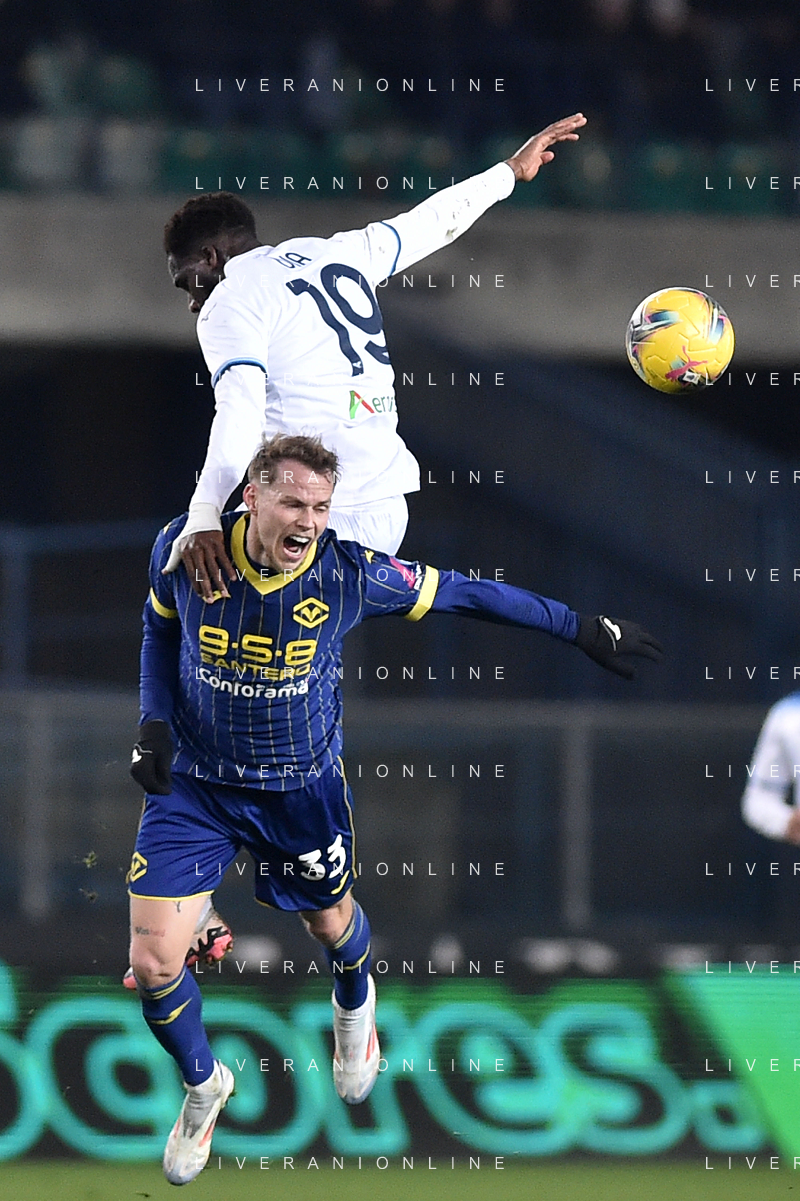 Casper Tengstedt of Hellas Verona FC heads the ball during Hellas Verona FC vs SS Lazio, 21° Serie A Enilive 2024-25 game at Marcantonio Bentegodi stadium in Verona (VR), Italy, on January 19, 2025. (Photo by Davide Casentini) - AGENZIA ALDO LIVERANI SAS