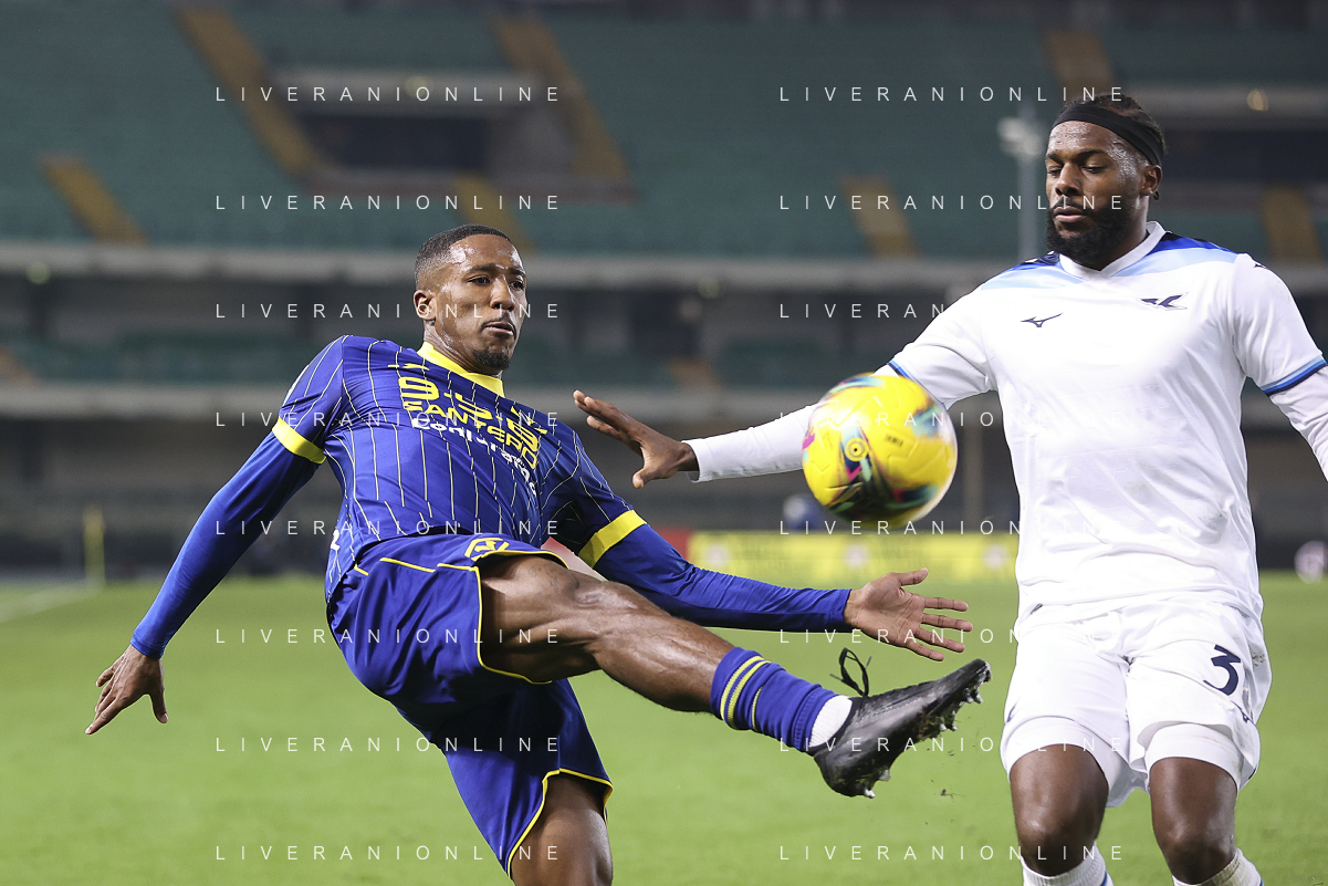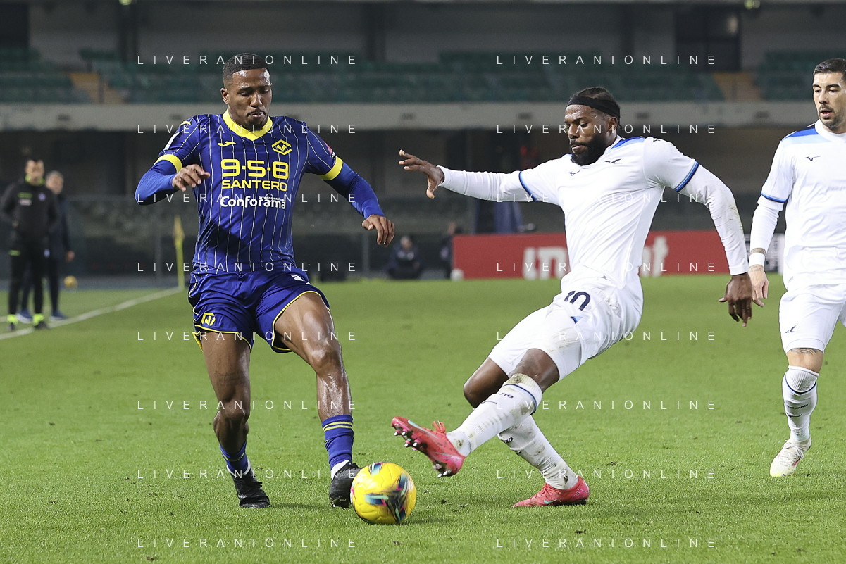 Jackson Tchatchoua of Hellas Verona FC competes for the ball with Nuno Tavares of SS Lazio during Hellas Verona FC vs SS Lazio, 21° Serie A Enilive 2024-25 game at Marcantonio Bentegodi stadium in Verona (VR), Italy, on January 19, 2025. (Photo by Davide Casentini) - AGENZIA ALDO LIVERANI SAS